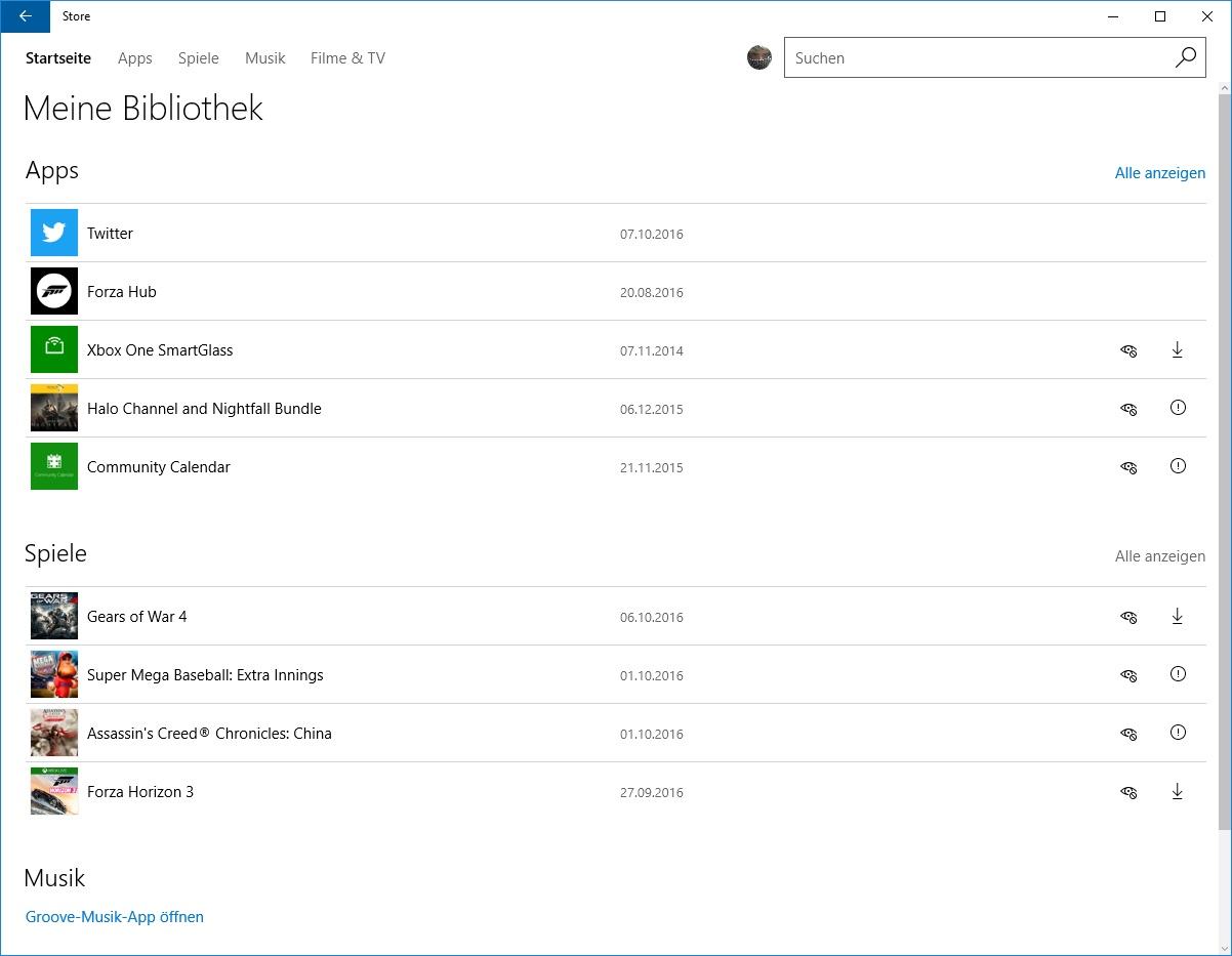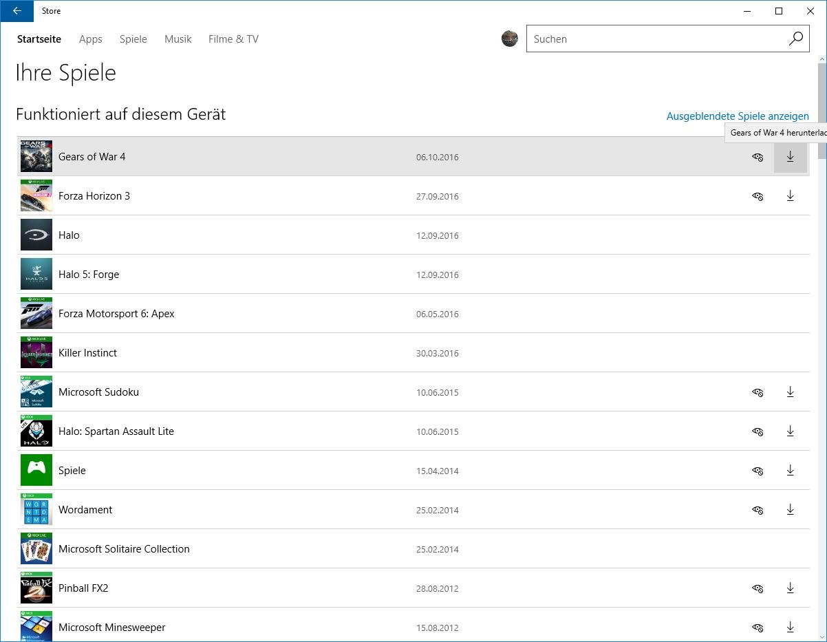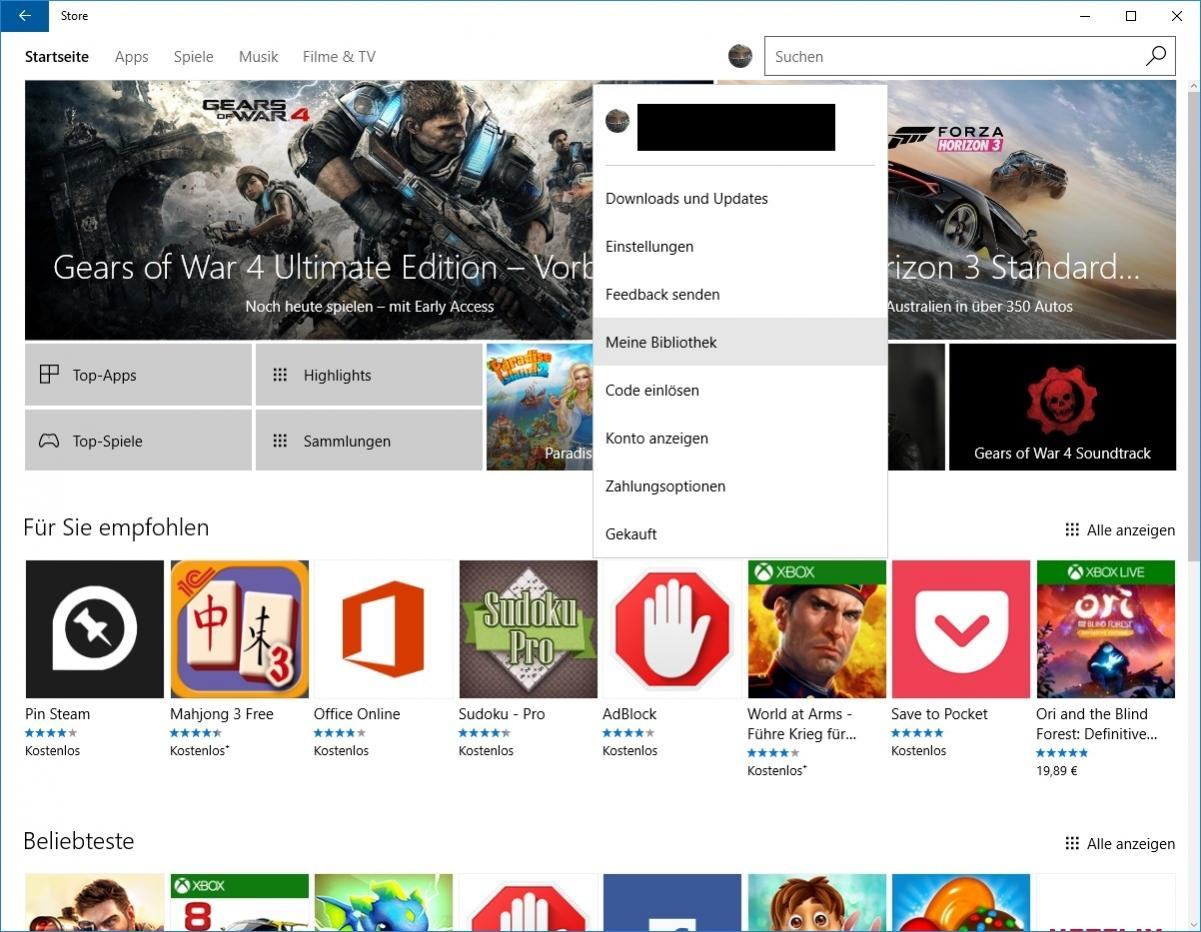 8.1. Um es aufzurufen, klicke auf dein Benutzerbild und wähle „Bibliothek“ aus. Du siehst „Gears of War 4“ dann in der Kategorie „Spiele“.
