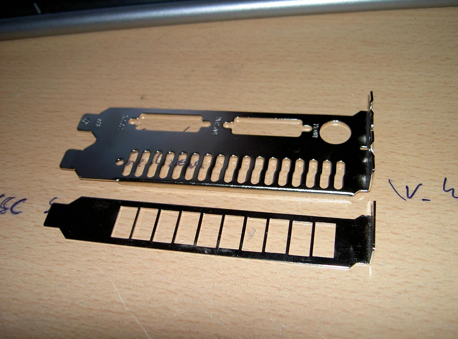 P.S. Im Anhang übrigens mal ein Foto von meiner verbesserten Kühlung. Hab das Slotblech noch zusätzlich gemoddet und die Streben entfernt. Jetzt sind sogut wie keine Luftgeräusche mehr. Wenn Gainward kein Bios mit regelbaren Lüfter bringt dann kann ich mittlerweile auch so mit der Lautstärke leben da ich die Luftgeräusche ja massiv verringert habe. Zur Verdeutlichung mal die Gainward Doppelslotblende und die normale AC Slotblende, die wie schon gesagt noch ihre Streben eingebüsst hat.