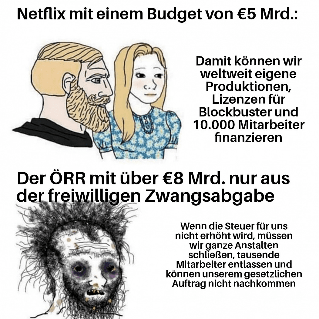 + Es wird nur von Leuten bezahlt die es nutzen , nicht als Zwang mit einem Programm nur für eine Zielgruppe.Leider irgendwie zu wahr. Und bei Netflix reden wir, abseits obs jemanden gefällt oder net, von durchaus hochpreisig gemachten Serien/Filmen, nicht irgendein 0815 zzz Promi im nächten Budget Krimi