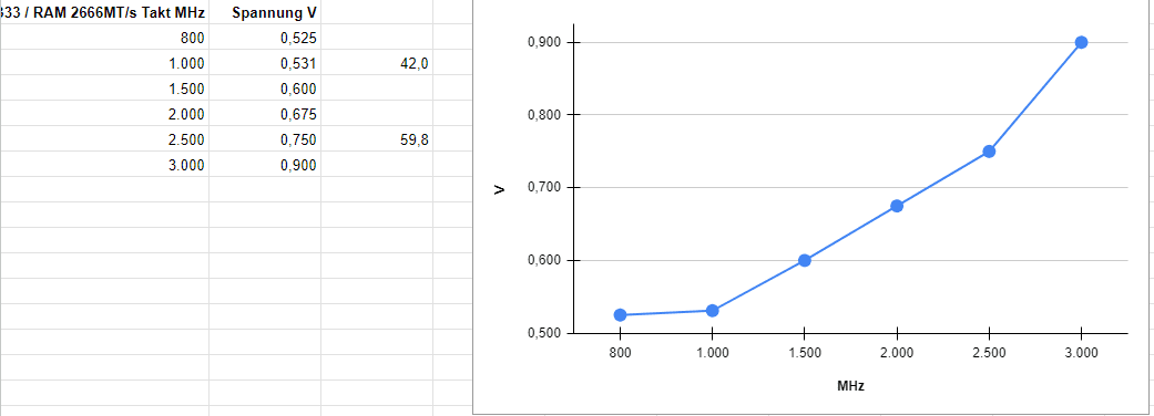 Bei 2666MT/s = IF1333 liegen 0,95V an, bei 2133/1067 sind es dann 0,85V was in ~4-5W weniger Verbrauch für den SoC resultiert, laut HWinfo.