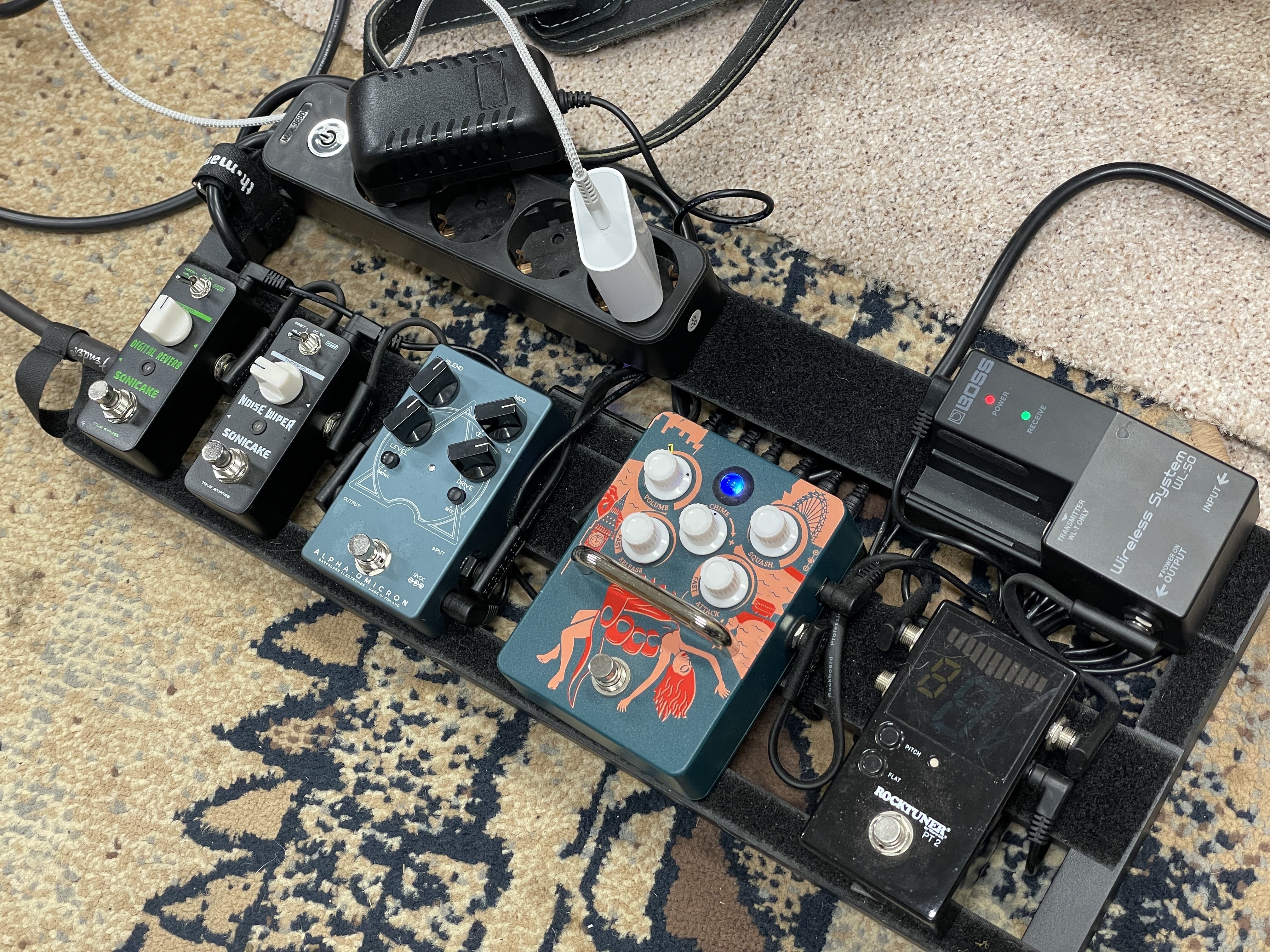 Anfangs dachte ich, ich komm auch gut ohne Pedalboard aus, aber lang dauerte es nicht, fehlte was. Kompressor, da das für das Rockgenre immer ganz gut ist, zumindest etwas auszugleichen, auch wechsle ich zwischen Finger und Pick, je nach Song. Lang hab ich gesucht nach einem Overdrive-Pedal, was auch untenrum was mitnimmt und da bin ich nach Boss und MXR bei DarkGlass gelandet - das Teil ist einfach episch. Der Rest eher so Spielerei. Im Bandkontext würde vielleicht mal noch ein Octaver ganz gut tun - mal sehen.
