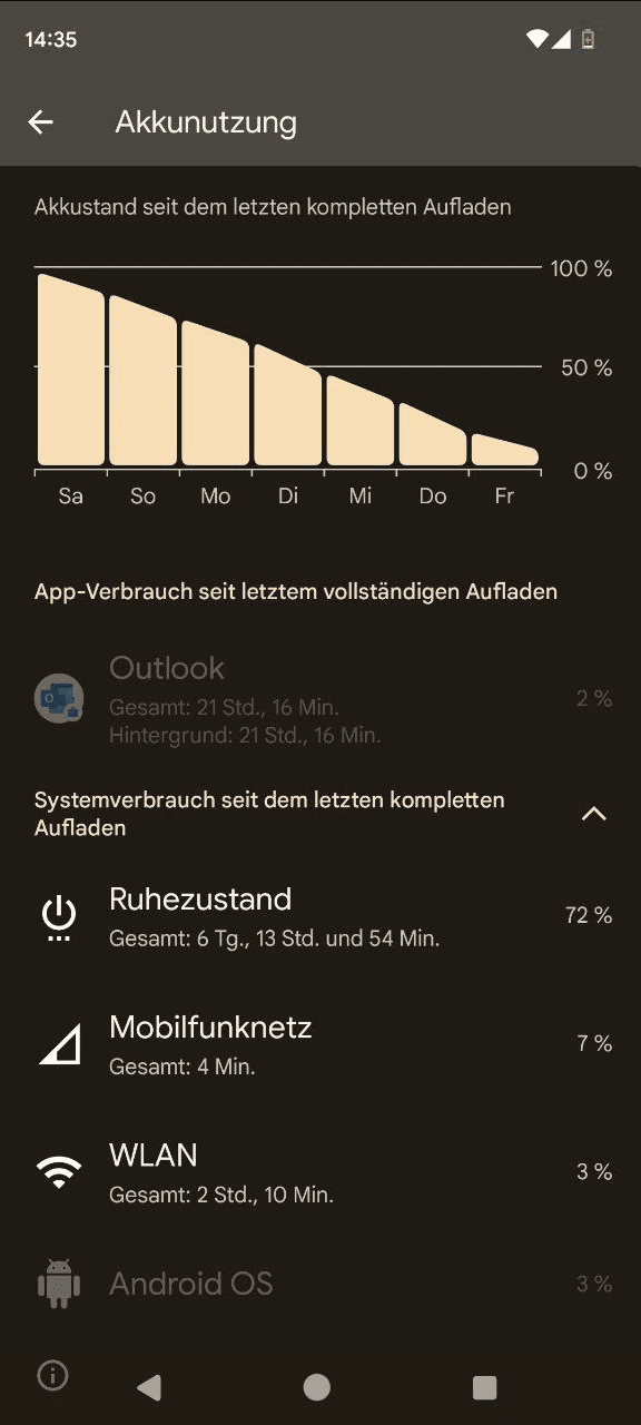 Alle Updates installiert; 5G ist aus; Energiesparmodus dauerhaft an; kein Google Konto eingerichtet; neben Telegram, Teams und Outlook ist nichts groß installiert. Ich habe es Freitagabend voll geladen und seitdem war es auf "nicht stören"; zwischenzeitlich nur ein Foto und den Screenshot gemacht - trotzdem ist es schon auf 71% runter!? Was kann man tun oder ist das normal?