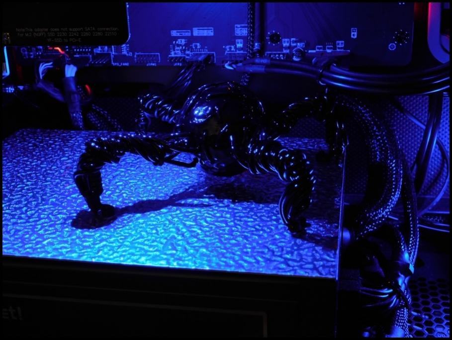 Und man beachte das Bauteil, neben dem PCIe Adapter. Es handelt sich um einen selbstgebauten Schlüssel um die Verschlussschraube im Ausgleichsbehälter, leichter lösen zu können falls das System gewartet werden muss.