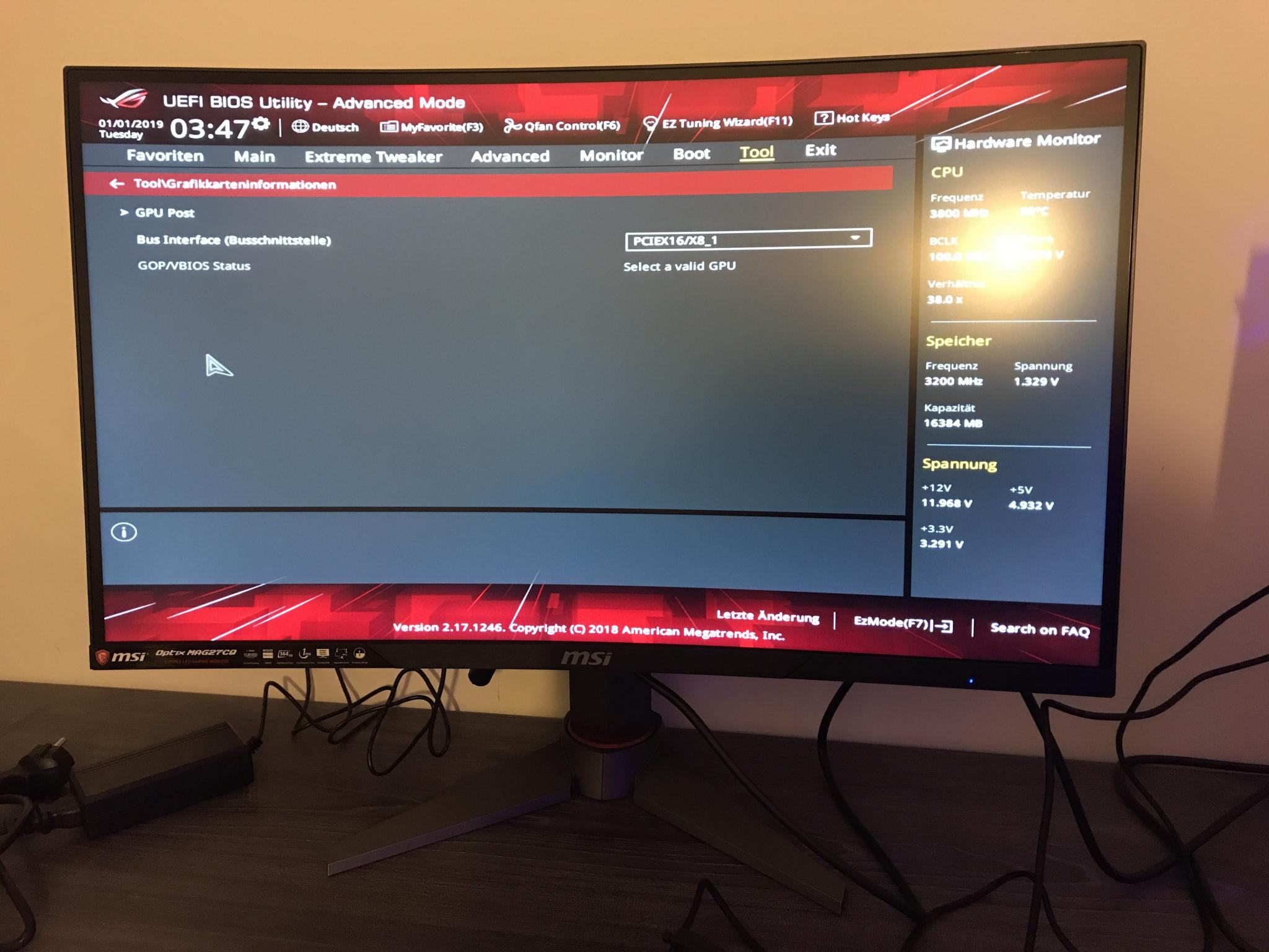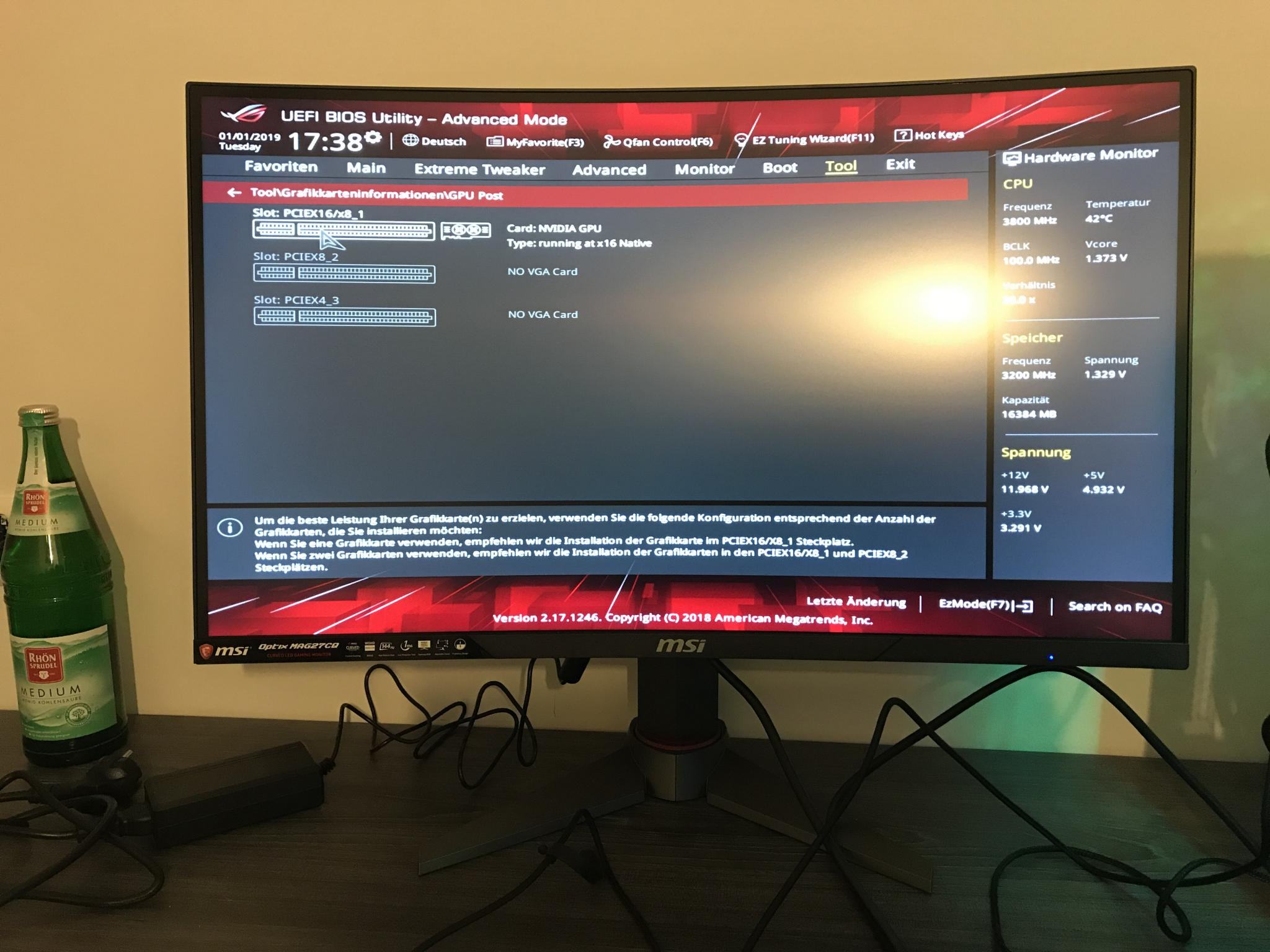 Und jetzt zum eigentlichen Thema, und zwar habe ich gestern meinen pc zusammengebaut und als ich ihn startete war er für 3-4sekunden an ging dann wieder aus. 3-4sekunden nach dem ausgehen ging er wieder an piepte ein Mal zeigte den Fehlercode b2 beim qcode und da ich kein OS habe hat sich das Bios geöffnet. Dort wird aber die Karte leider nicht erkannt.