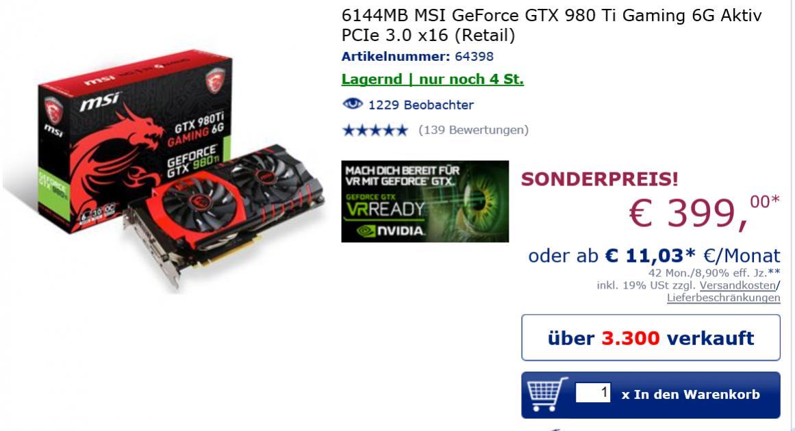 Würde da eher dieses Angebot wahrnehmen: Palit Geforce GTX 980 Ti Jetstream + Xbox-360-Controller für 384€ inkl. Versand nach DE [Saturn.at] - mydealz.de