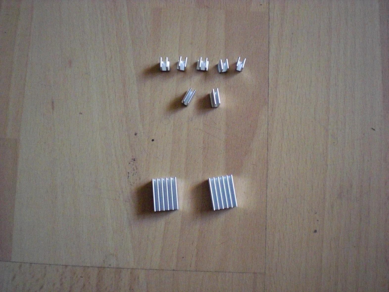 Nach ersten Tests, habe ich mir dann überlegt, die Ram-Kühler mit Arctic Silver Premium Silver Thermal Adhesive auf den SpaWa-Kühler zu kleben. Ich habe einige der Kühler mit meinem Aldi-Dremel zugescheiden müssen. Das ganze sieht nun so aus: