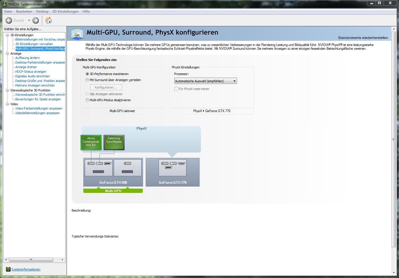 Wenn ich "3D-Performance aktivieren" wähle, so nimmt die Steuerung immer nur die beiden GPU's der 690er als verbund und schlägt die GTX770 für Phys-X vor.