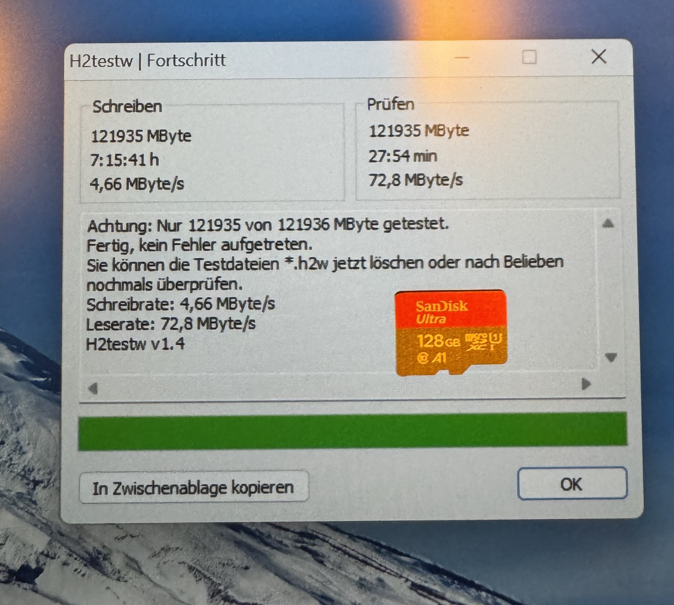 Habe folgendes Ergebnis nach der Prüfung einer Sandisk ultra 128 GB erhalten. Zwar ist der Speicher vollständig jedoch ist die Schreib Geschwindigkeit absolut unterirdisch.