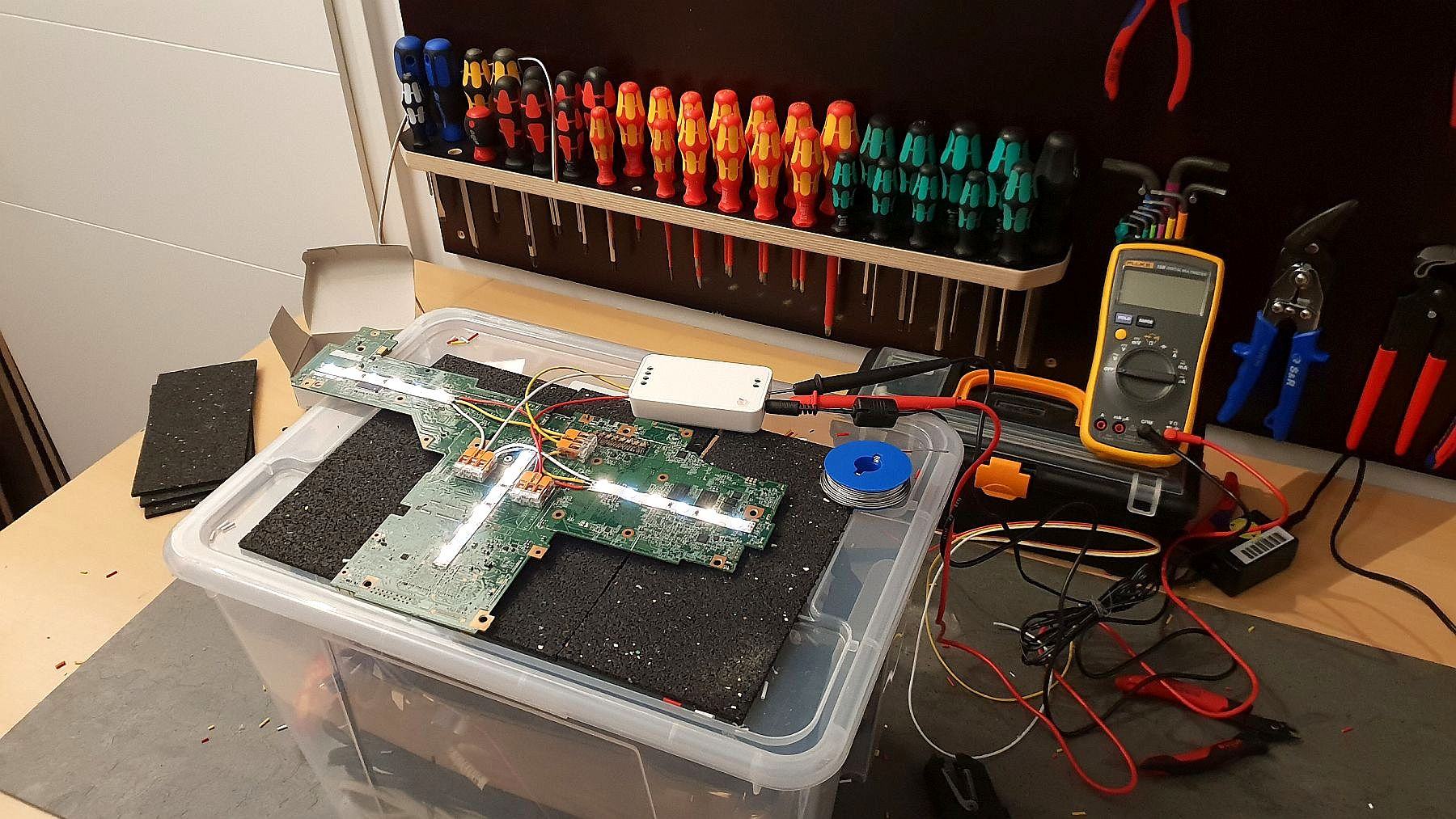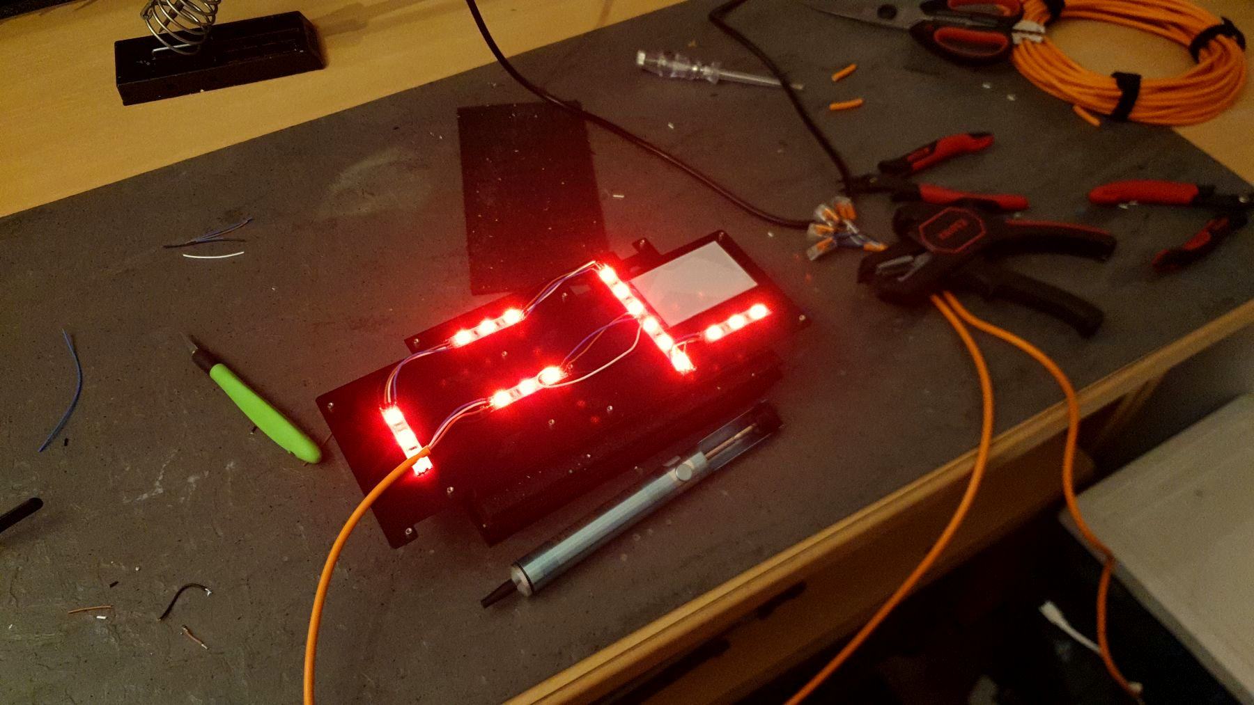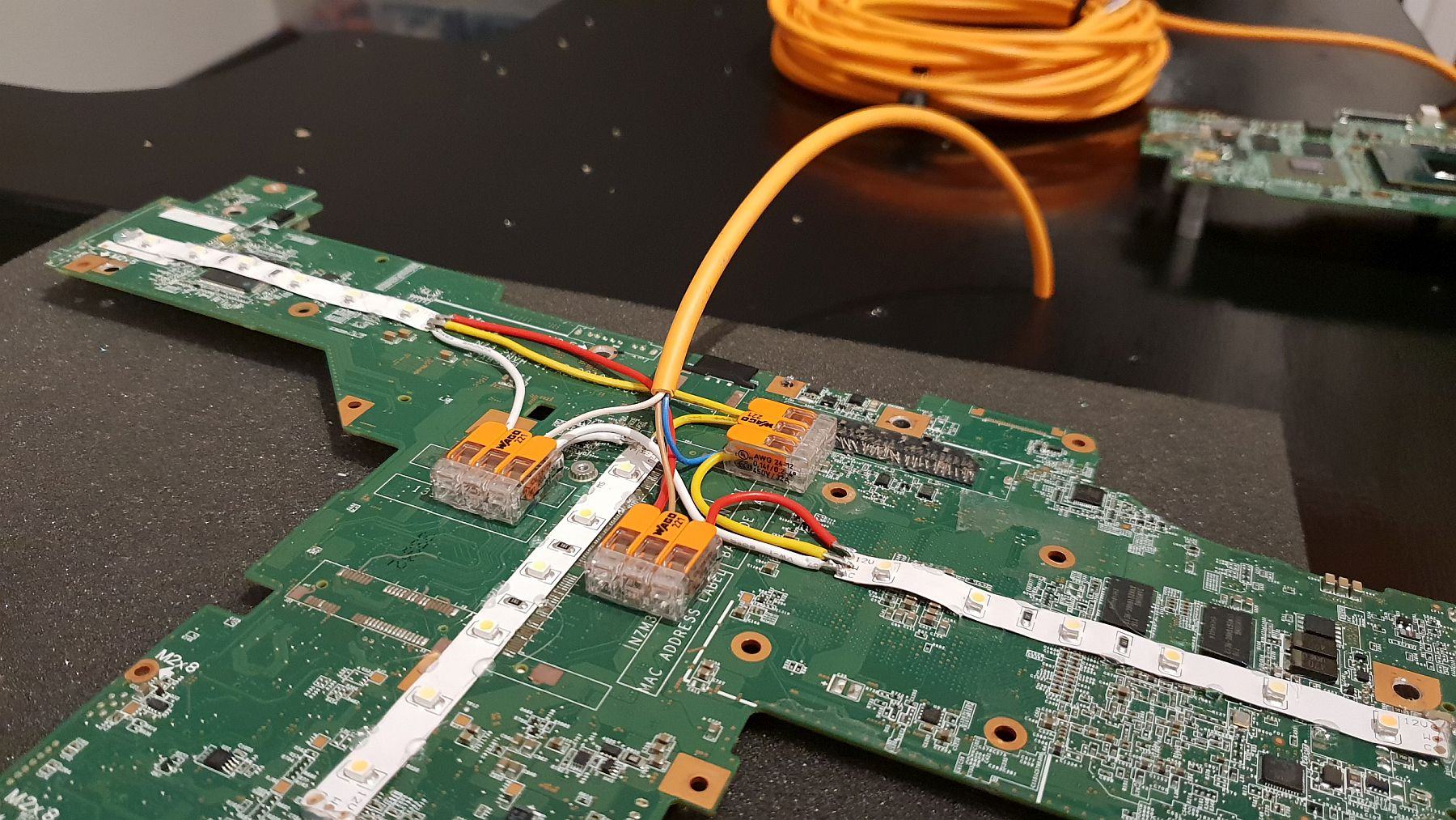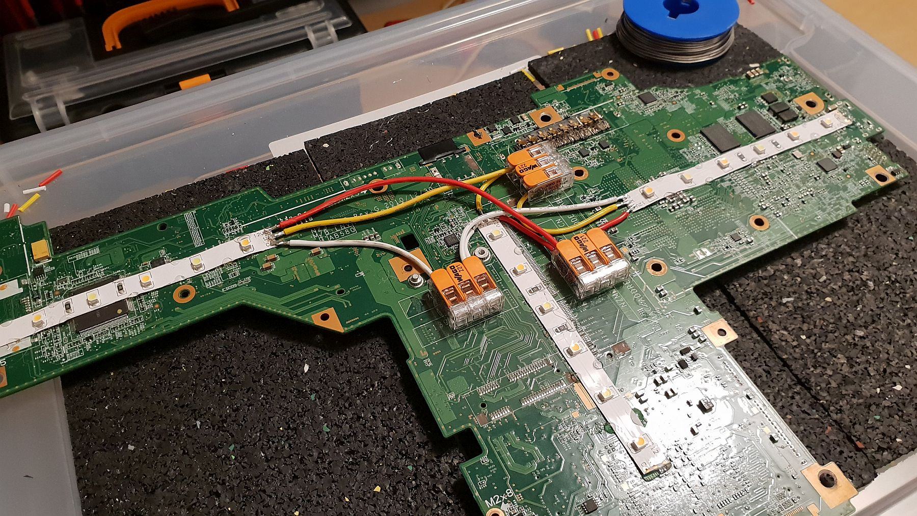 Der Rest, der nicht (PCB) oder nur teilweise leuchtet (Backplate) ist, wurde mit LED-Stripes ausgestattet. Bitte nicht hauen für meine Lötkunst oder das Kabelmanagement. Heute, nach etlichen Jahren Bastel-Erfahrung, würde ich einige Sachen etwas anders machen. Grundsätzlich aber funktioniert die Beleuchtung heute noch.