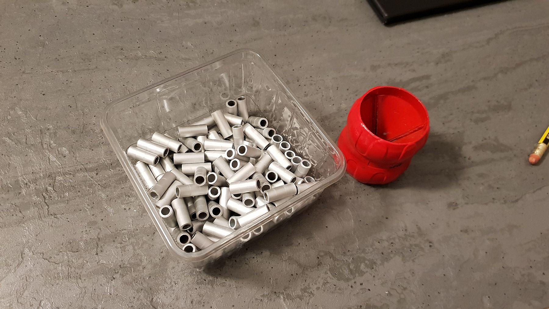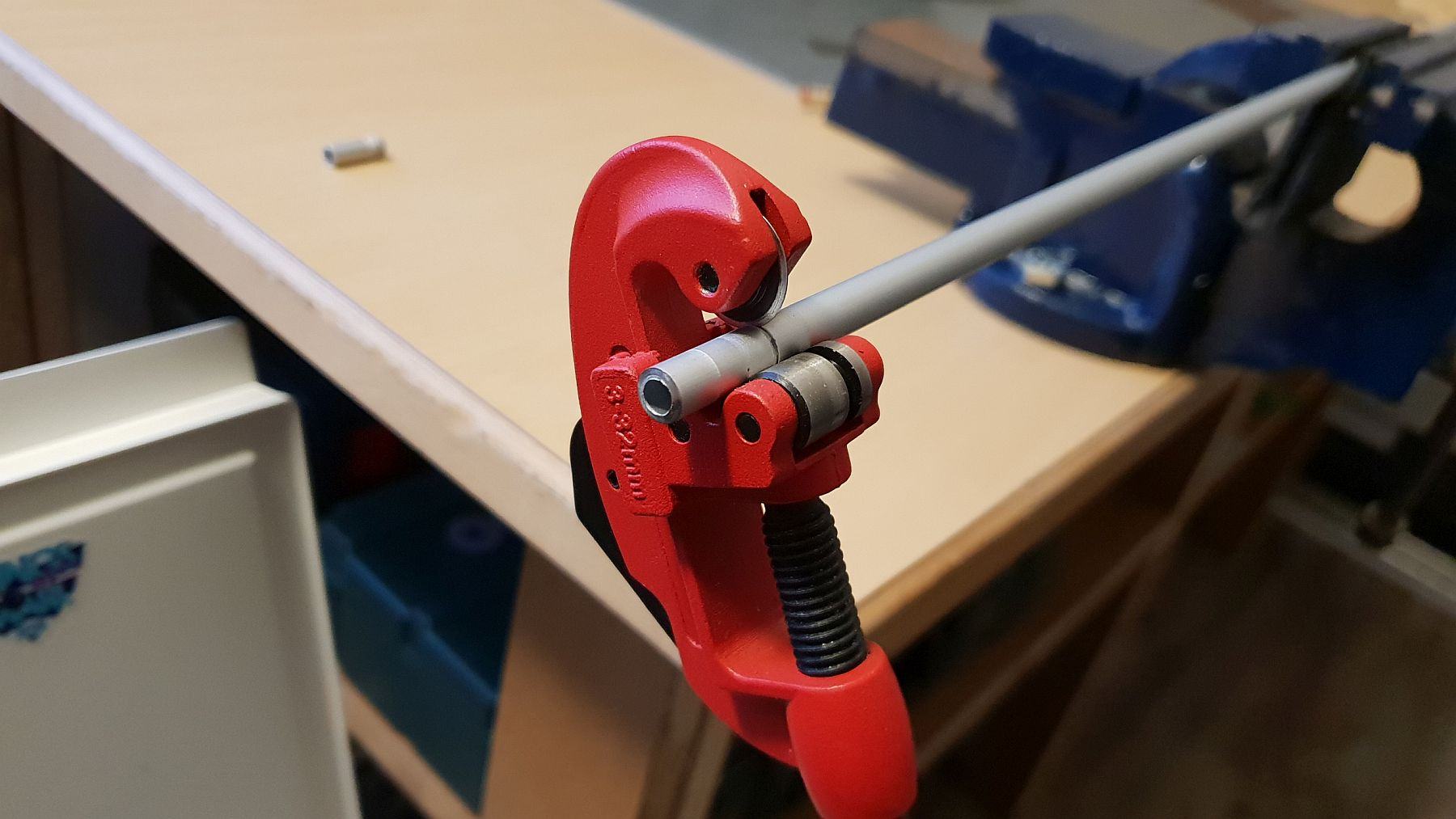 Die Abstandhalter hierfür (auch bei den anderen Projekten) fertige ich immer selbst an. Dazu nehme ich ein Alu-Rundprofil und einen Rohschneider. Kurz messen, passend abschneiden und entgraten, fertig.