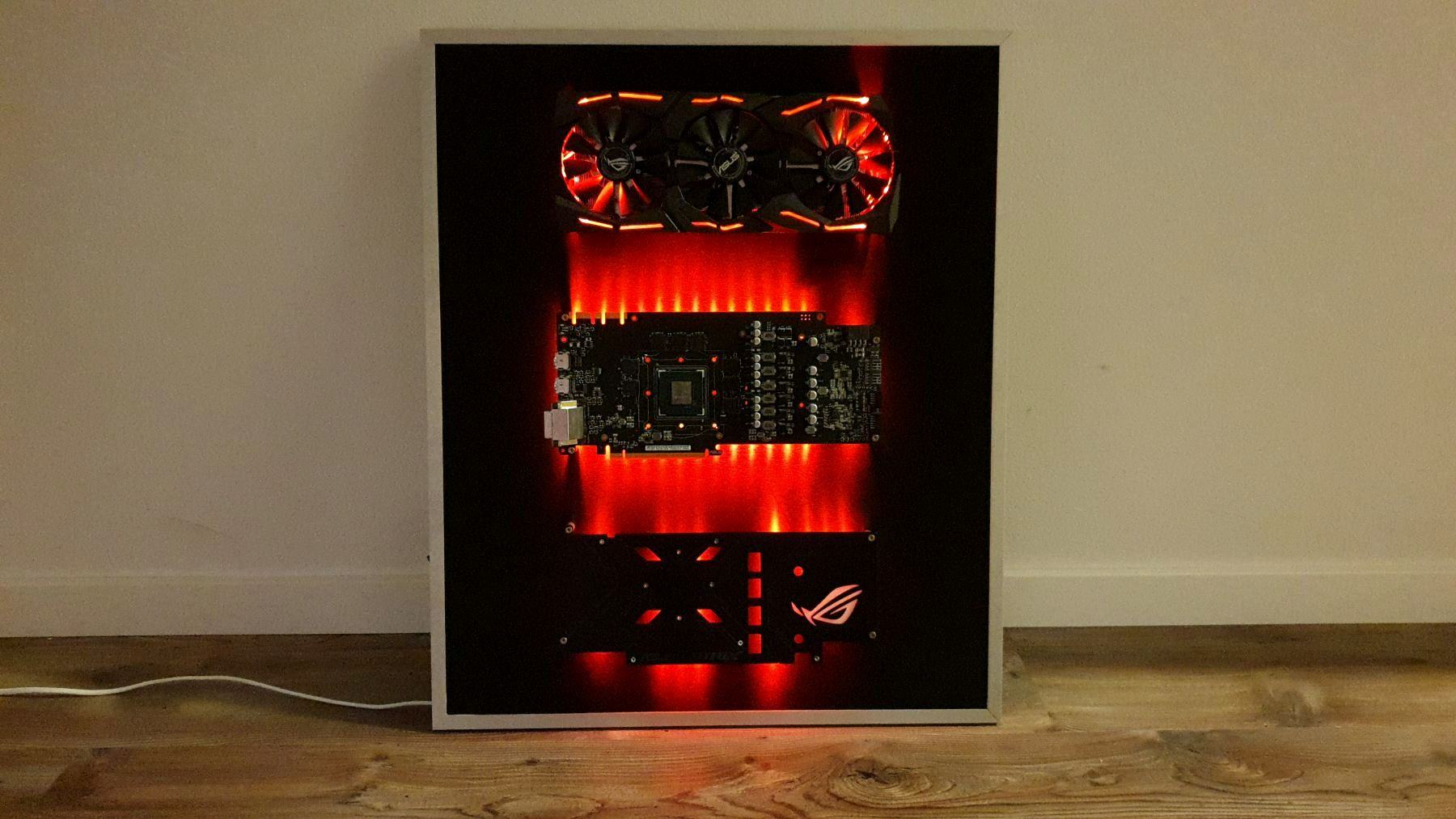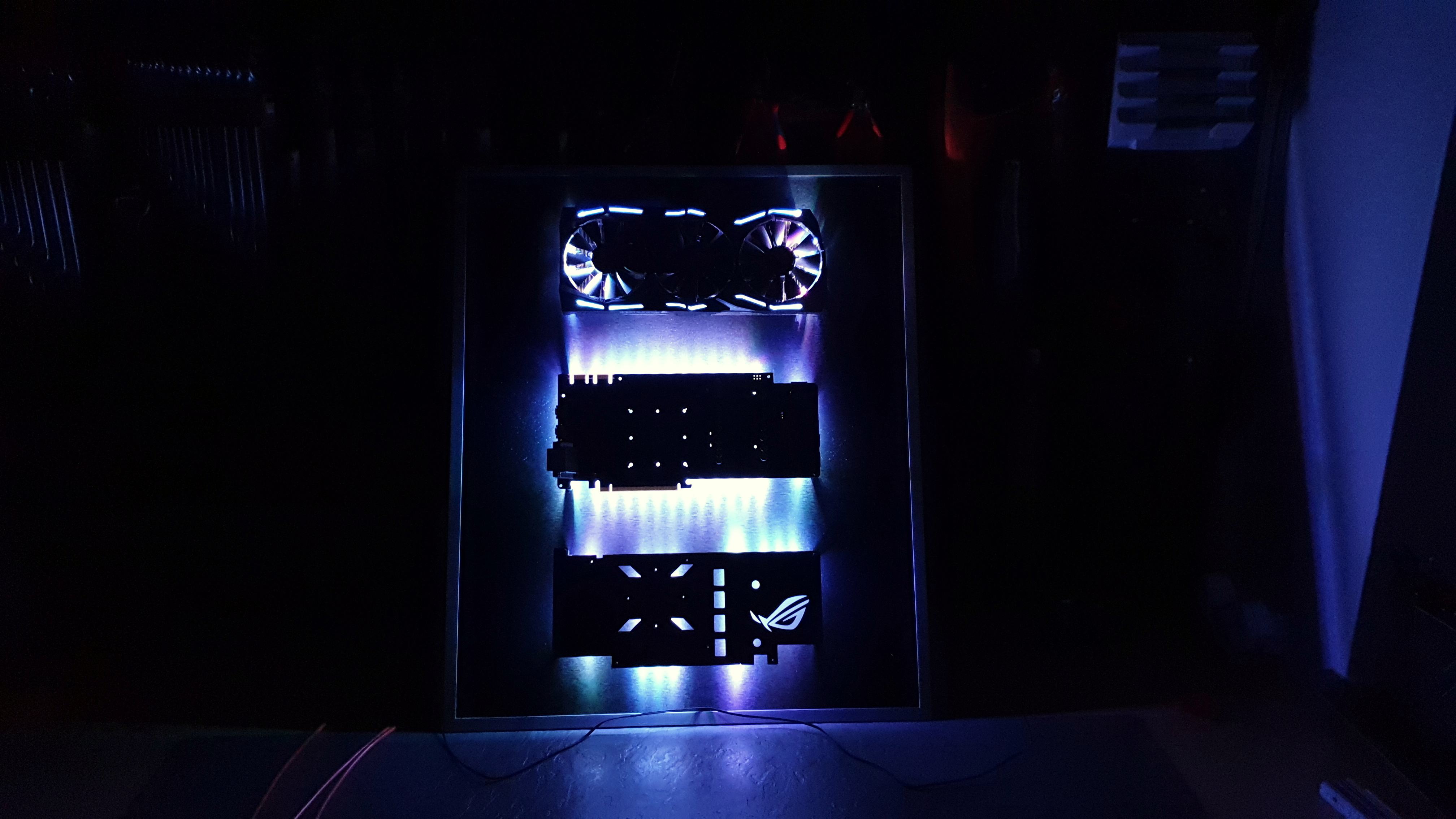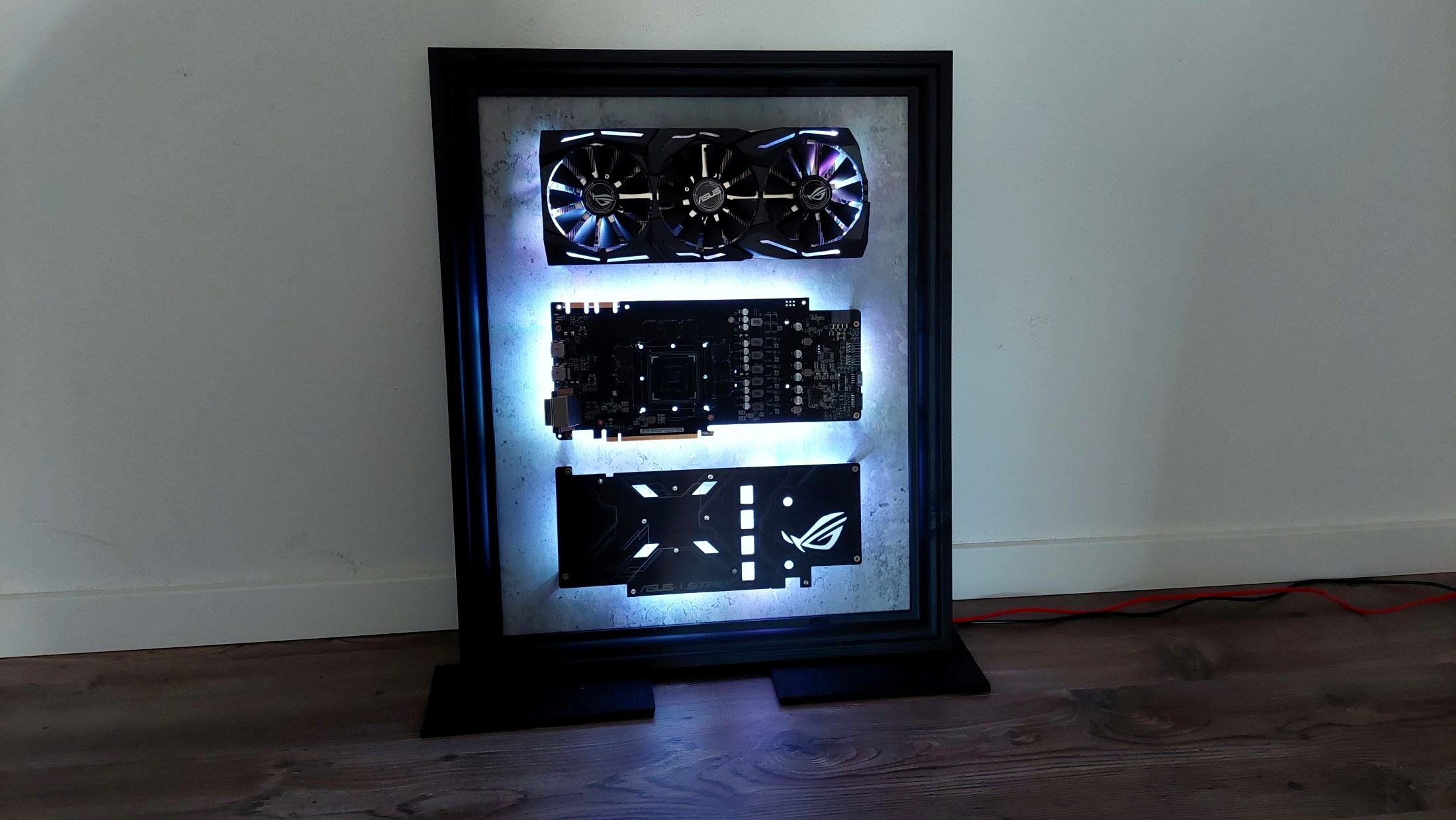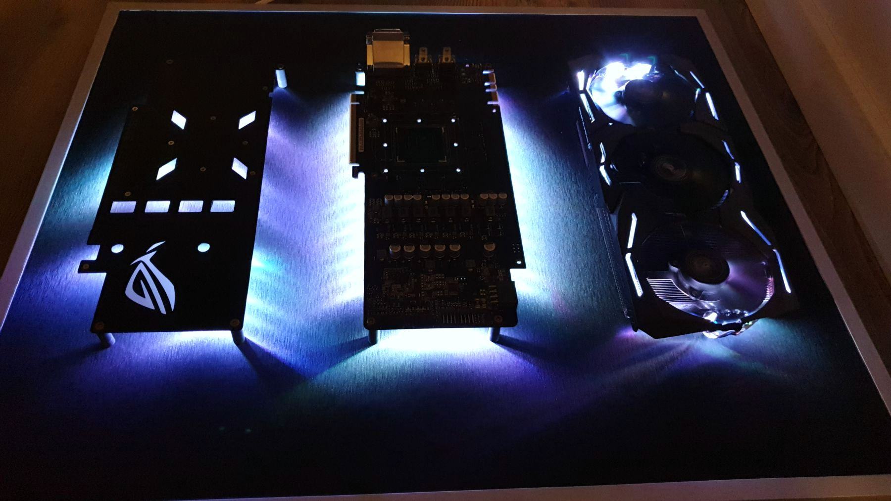 Eine andere Möglichkeit ist die gesamte Karte inkl. Kühler, Lüfter, Shroud, Beleuchtung und Backplate zu verwenden. Allerdings erfordert das auch deutlich mehr Arbeit, aber so wird halt alles genutzt. Als Basis habe ich auch hier den gleichen Bilderrahmen mit der gebürsteter Alu-Folie genommen. Um hier eine gleichmäßige Beleuchtung zu realisieren, ist es notwendig, dass die Hardware insgesamt etwas mehr Abstand zum Bild bekommt. So kommt die Beleuchtung deutlich besser zur Geltung als wenn man sie sehr flach zum Bild montiert.