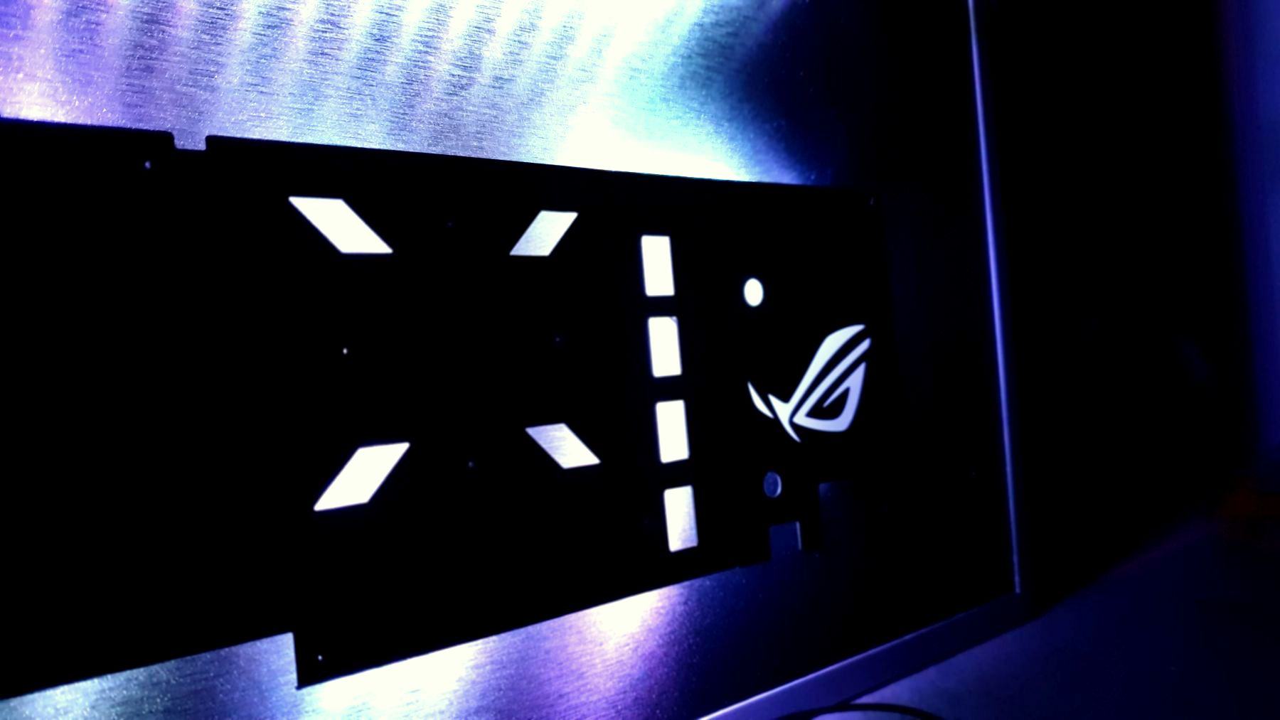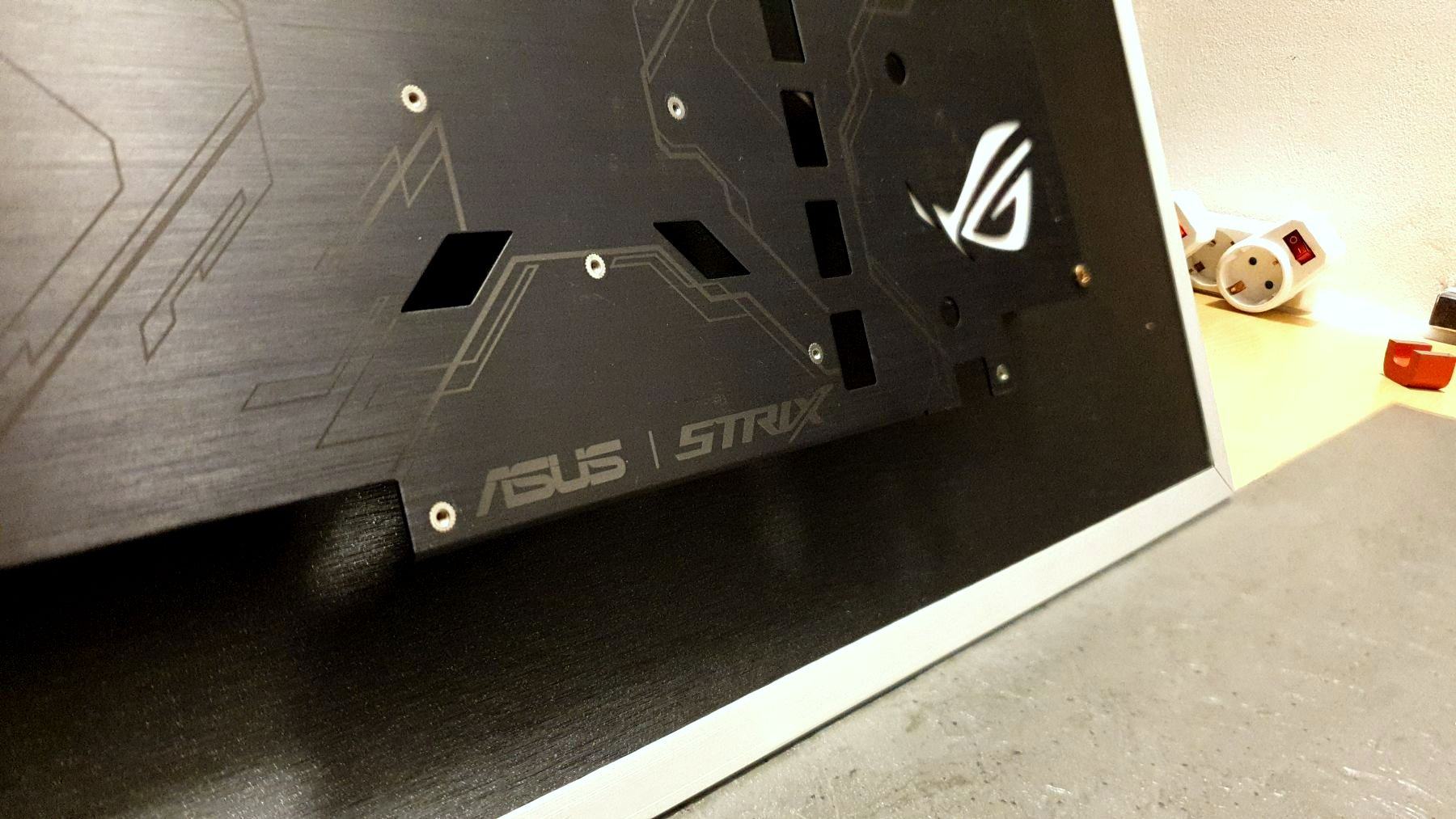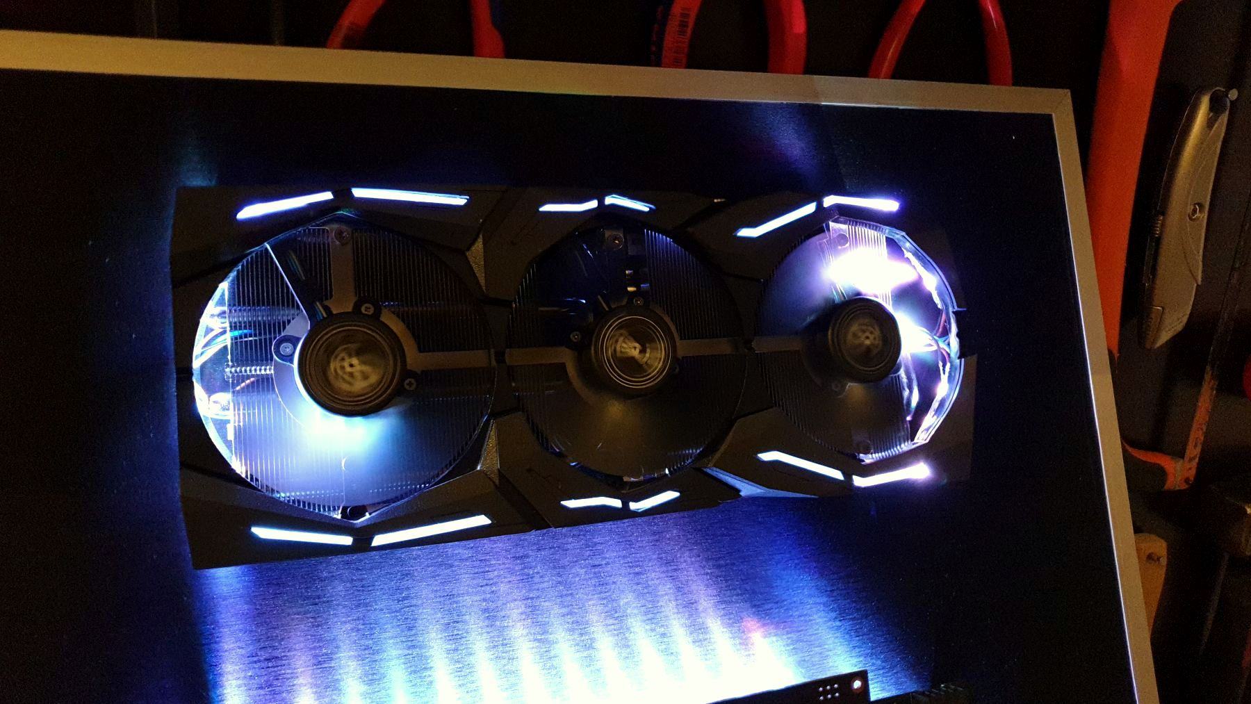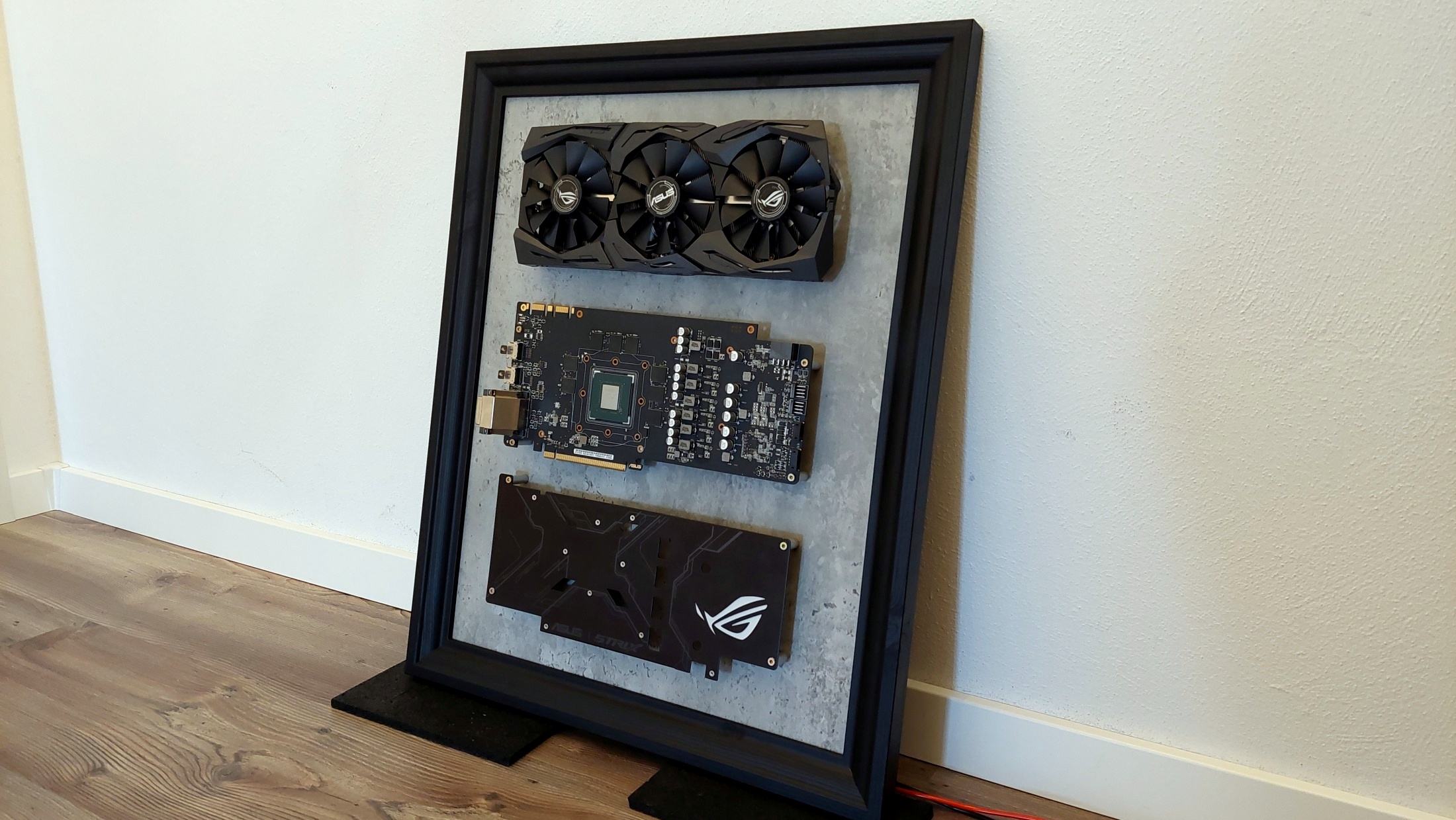 Eine andere Möglichkeit ist die gesamte Karte inkl. Kühler, Lüfter, Shroud, Beleuchtung und Backplate zu verwenden. Allerdings erfordert das auch deutlich mehr Arbeit, aber so wird halt alles genutzt. Als Basis habe ich auch hier den gleichen Bilderrahmen mit der gebürsteter Alu-Folie genommen. Um hier eine gleichmäßige Beleuchtung zu realisieren, ist es notwendig, dass die Hardware insgesamt etwas mehr Abstand zum Bild bekommt. So kommt die Beleuchtung deutlich besser zur Geltung als wenn man sie sehr flach zum Bild montiert.