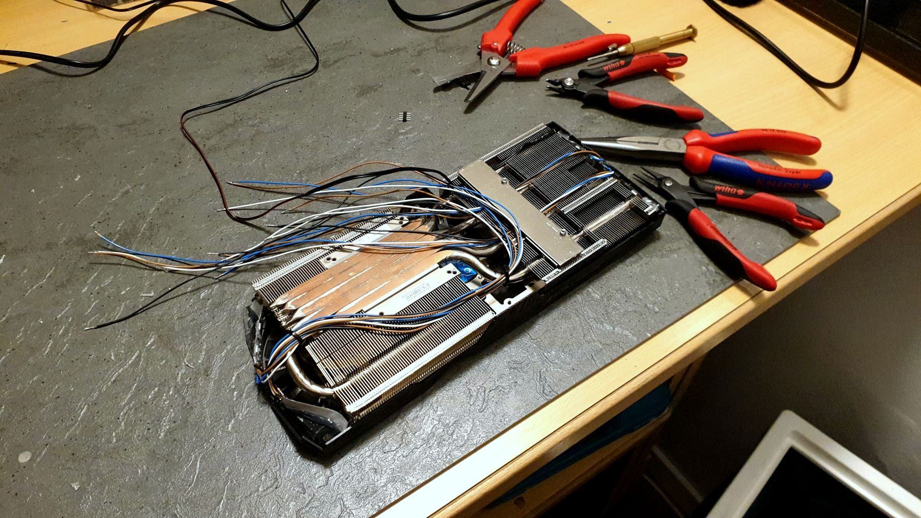 Danach alle GPUs demontiert, ordentlich gereinigt, auf dem Bild ausgerichtet und mit kleinen Abstandhalter (Muttern) montiert.