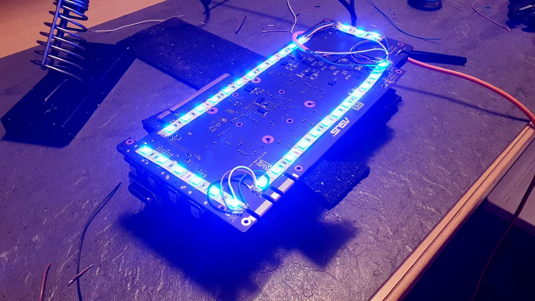 Diese Karte hat bei mir einen besonderen Stellenwert, weswegen ich sie unbedingt als Deko haben wollte. Anders als bei der ASUS Karte, wollte ich diesmal nur die Beleuchtung nutzen. Hierfür muss man zunächst prüfen, ob die Beleuchtung auf 12V oder 5V läuft und ob es RGB oder ARGB ist. Mit dem passenden Messwerkzeug ist das aber schnell ermittelt und keine große Sache.