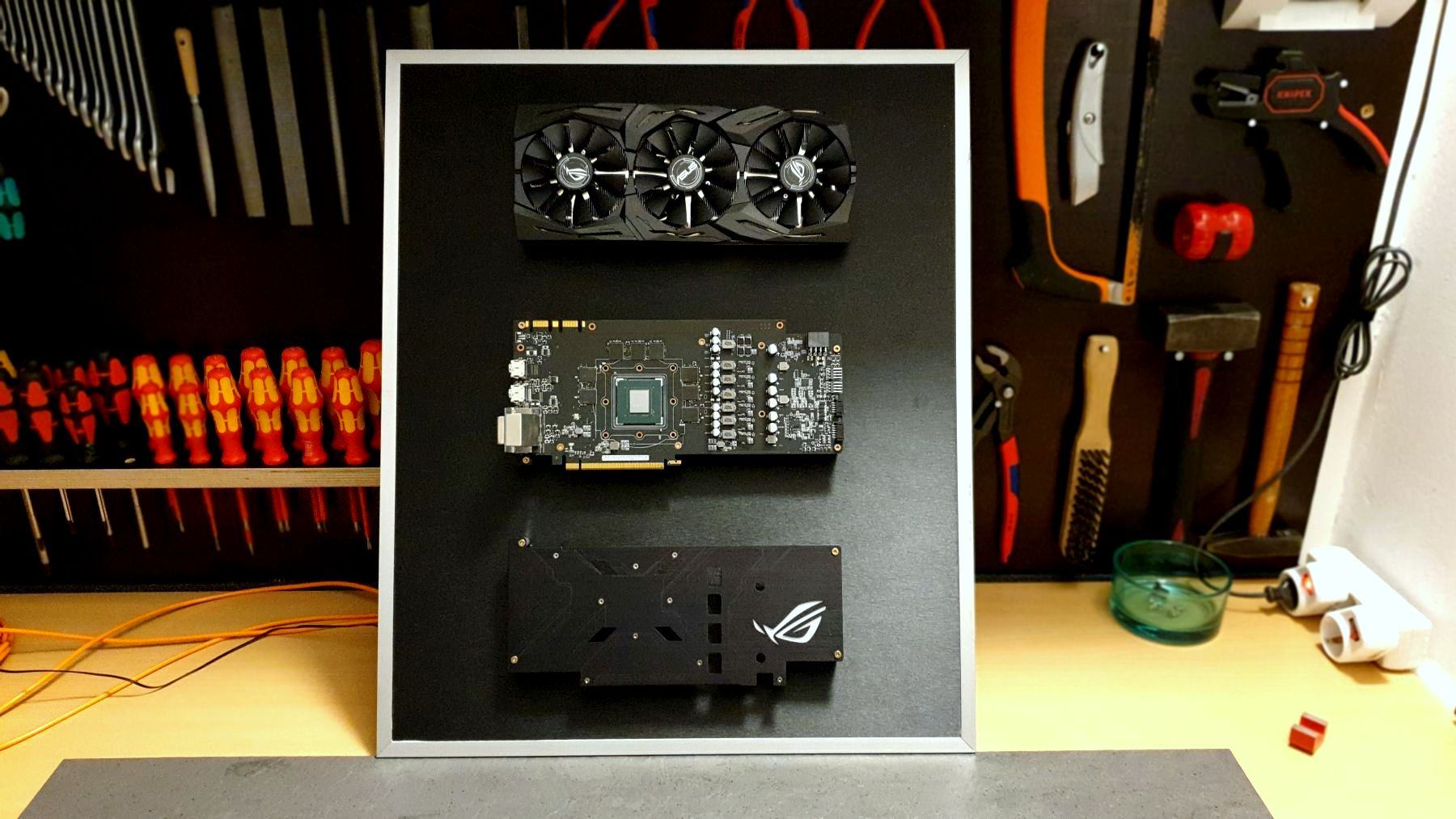 Da die Bilder teilweise aus dem Jahr 2017/2018 kommen, sind für heutige Verhältnisse entsprechend "alte" (teilweise auch funktionierende) Karten dabei. Sollte aber kein Problem sein, weil es primär um die Umsetzung als Idee geht, welches man in der Theorie dann auf jeden GPU-Umbau anwenden kann. Ich habe hier jetzt unterschiedliche Beispiele, wie man die Grafikkarten in Szene setzen kann. Als Basis habe ich für alle GPUs einen 50 x 60cm großen Bilderrahmen mit Alu-Rahmen (aus U-Profilen) genommen. Nun hängt es ein wenig davon ab, inwieweit man sich mit den "Features" austoben möchte. Neben einem einfachen Bild, bis hin zu funktionierenden Lüftern und Beleuchtung, steuerbar über PC wenn man möchte, ist alles möglich.