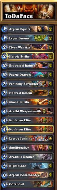 Ich hab übrigens dieses Deck gespielt dafür. Klappte um einiges besser als Tryhard, weil doch viele da alle möglichen Taunts drin haben. Winrate bei rank 20 ca. 400:20, ohne jetzt die Aufgaben zu zählen (bin auch paar mal raus, als der Gegner pro Zug gefühlte 30 Sekunden gebraucht hat)