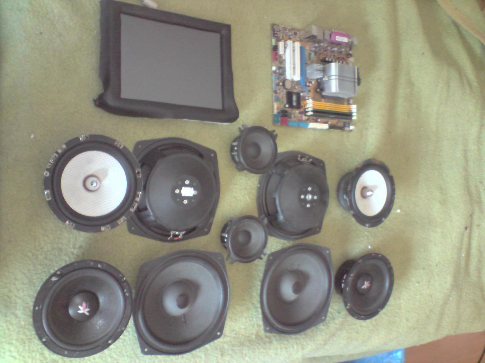 Soo Teilelieferung bekommenJetz kanns langsam ans Basteln gehen, 4*20cm Neodym Chassis von Mbquart, 2*10cm Mitteltöner von Mbquart, 2*16cm Kickbässe von BM Audio, 2*16cm Kickbässe von Hifonics, Asus M2A + AMD Athlon X2 4450e, 4Gb Ram, und ein 10,7 Zoll Touchscreen Display ( 1024*786 )