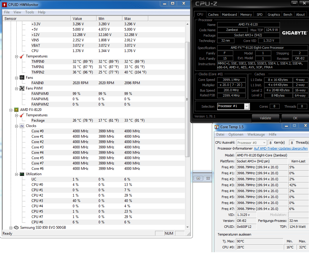 Chip: AMD FX8120 Zambesi 125w 3.6 GHz ( gekühlt von einer corsair H100 3te stufe)