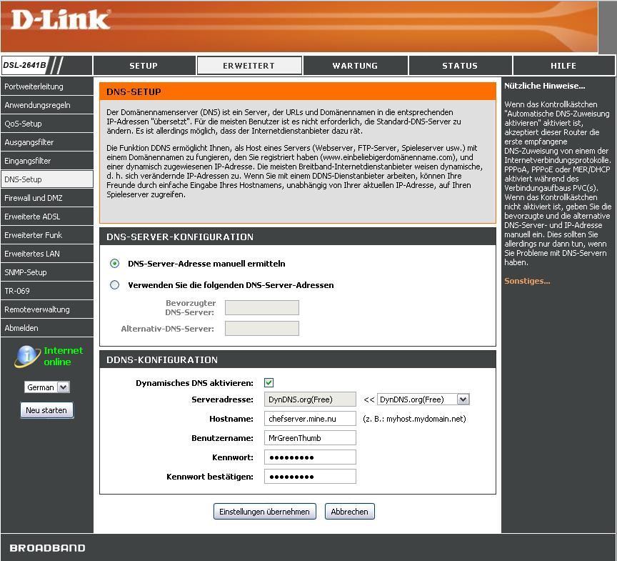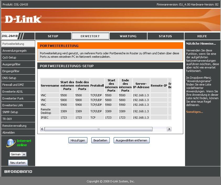 Ich habe schon ein paar Sachen Versucht mit Hilfe von diversen Anleitungen die ich gefunden habe. Zu est habe ich die FireWall von meinem Modem D-Link DSL-2641B frei gegeben. Ich hoffe richtig, siehe Foto. Denn habe ich den Remote Desktop auf dem Server frei gegeben. Muß ich da jetzt noch einen Benutzer anlegen und wie verschicke ich eine Einladung an mein Touch Pro? Wie funktioniert das mit DYNDNS? Wenn ich das richtig verstanden habe benötige ich dort einen Account um die IP immer gleich zu behalten. Habe ich auch für meine VNC Verbindung (ich habe schon eine VNC Verbindung von meinem privat PC zum Firmen Server). Habe diese Einstellungen aber leider nicht selber gemacht. Kann da also nur mit gefährlichen Halbwissen glänzen.