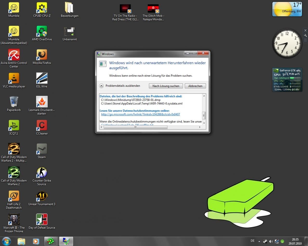 Ich brauche dringend eure hilfe, denn heute hab ich mir das oben genannte Bluray Laufwerk zugelegt doch immer wenn ich einen Bluray film anschauen möchte bekomme ich nach 1 oder 2 Minuten einen Bluescreen und der PC stürzt ab. Bitte Bitte kann mir jmd. helfen.