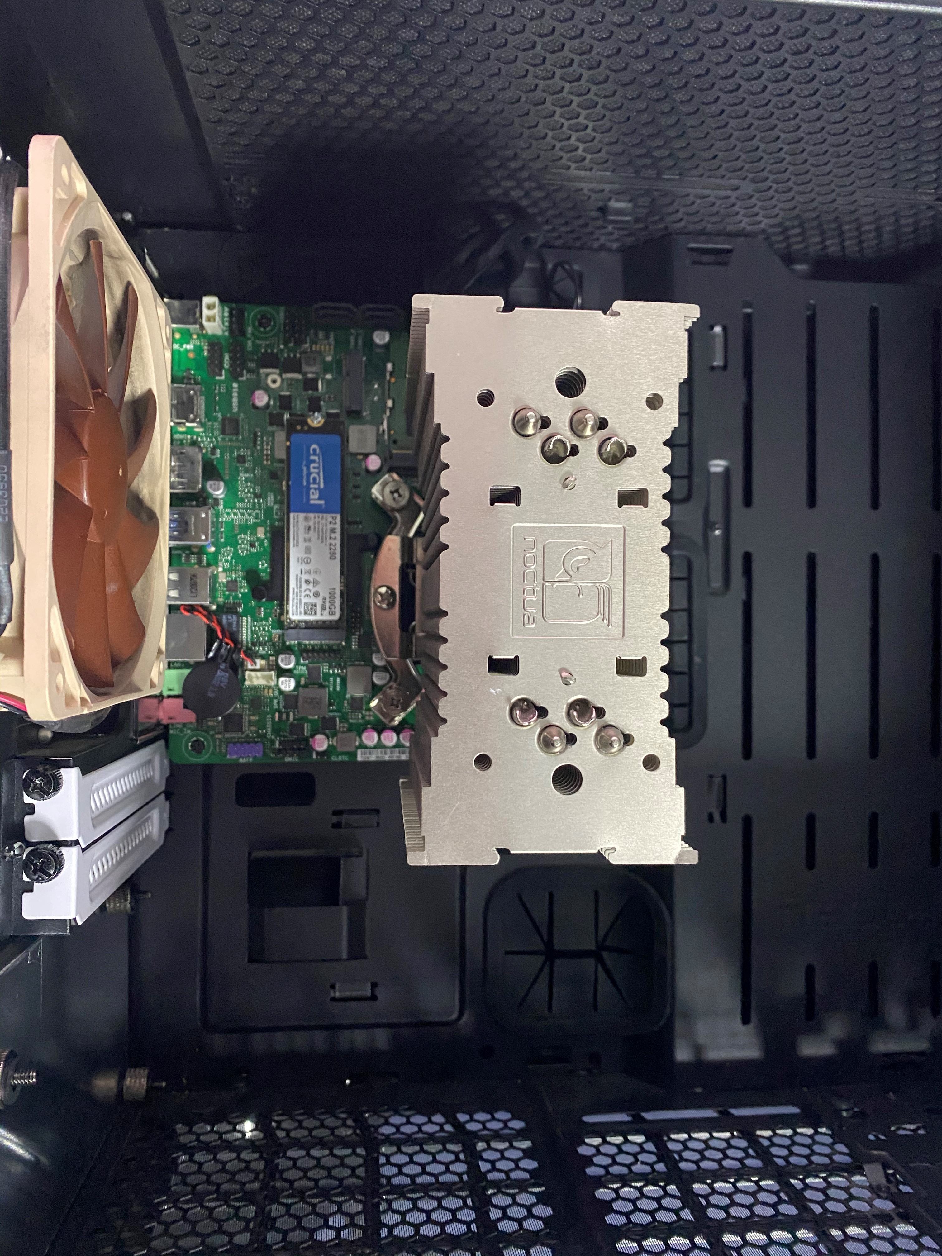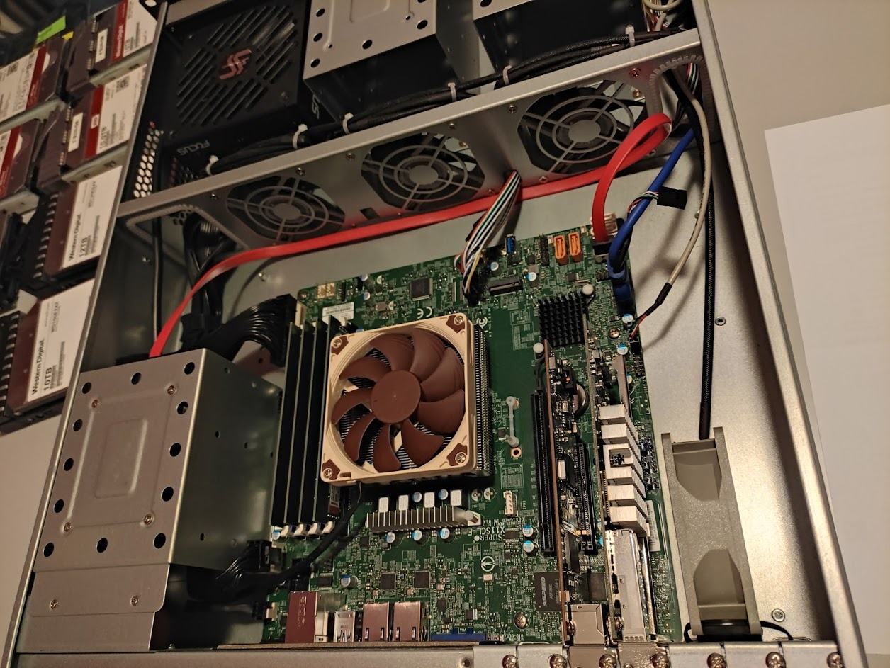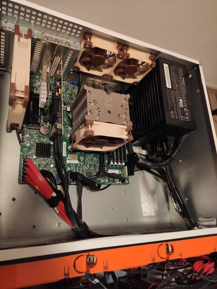 Einmal mein ESXI-AIO X570D4U-2L2T Build. Ryzen 5600X mit Noctua NH-D15, 64GB ECC, 2*970 Evo Plus 1TB , 6*14TB Ultrastar , 6*SSD SM863/SM883 (die sind rechts oben drinnen, wo die gelben Satakabel vom HBA reingehen). Als HBA ist ein Broadcom 9400-16i verbaut. Der Kühler ist etwas Overkill für die CPU, aber ich hatte ihn und wir sind ja im Luxx. Vorteil: mit dem 5600X reichen bei allen Frequenzen sehr niedrige RPMs und es gibt keine Boostlimits durch Temperatur. 73-75 Grad max bei Volllast aller Threads.