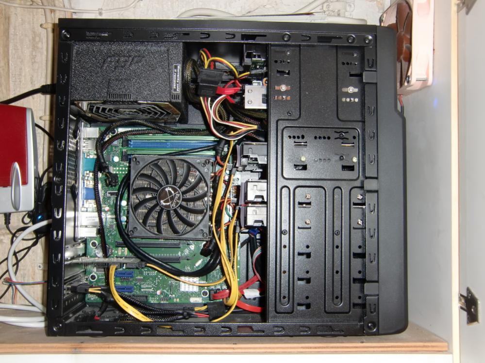 • Core i5-4570 unter einem Scythe Shuriken Rev. B Die CPU ist vermutlich stärker als nötig, aber ich bin trotzdem ganz glücklich damit. Der Minecraft-Server braucht relativ viel Power, wenn er läuft, und auch sonst ist es nett, wenn ich von unterwegs auf eine ordentliche Rechenleistung zugreifen kann, z.B. wenn ich mal schnell ein Video umkodieren will oder Ähnliches.