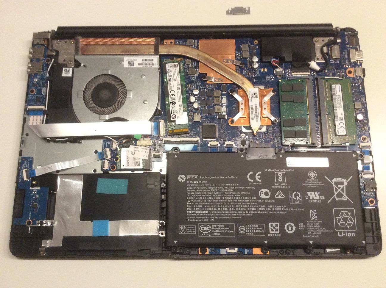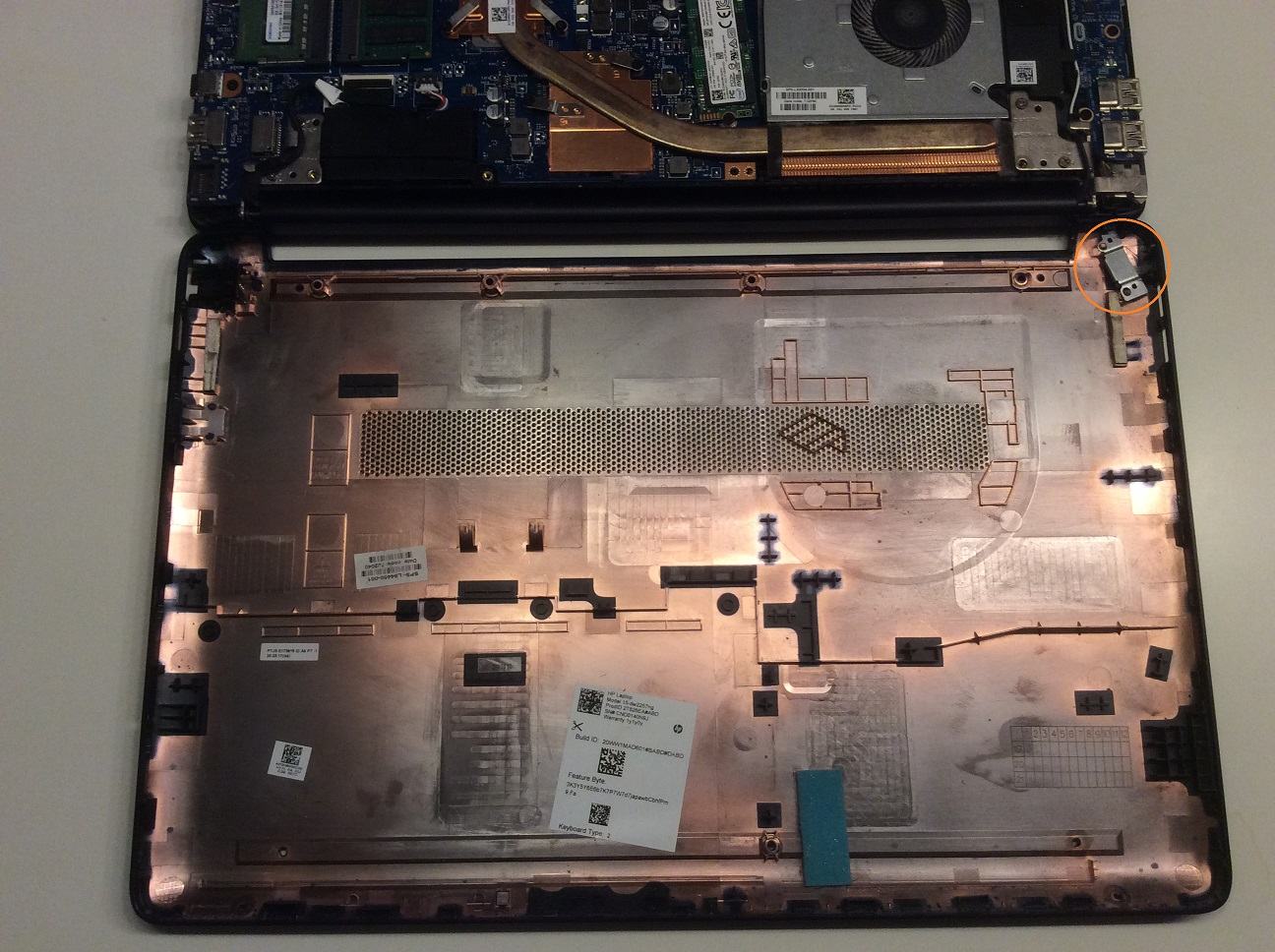 Ich habe ein RAM in meinem Notebook hinzugefügt. Als ich das Gehäuseunterteil vom Oberteil entfernt habe, sah ich ein Metallteil schräg oben auf der rechten Seite. Weiter habe ich nicht geprüft, ob es fest sitzt od. nicht.