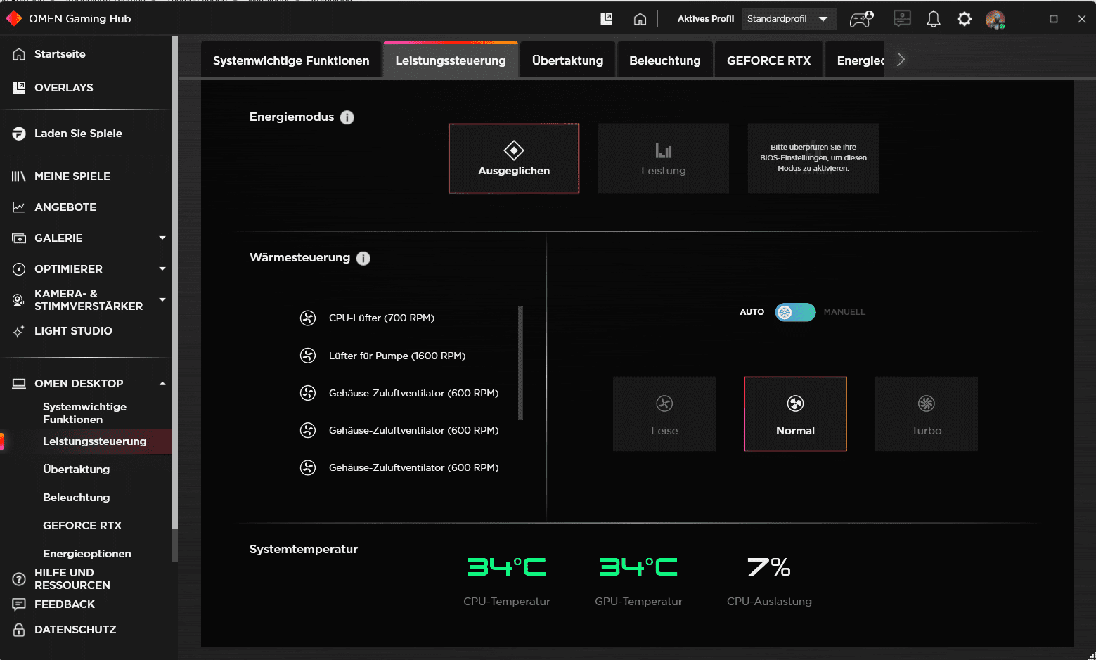 Comment: keine Veränderung; es gibt auf dem Rechner in W11 nur "ausbalanciert", ein weiteres Modi "Leistung" nur in der OMEN DESKTOP Software (siehe Screenshot). Meine Vermutung liegt hier. OMEN Software deinstalliert, gleiches Problem.