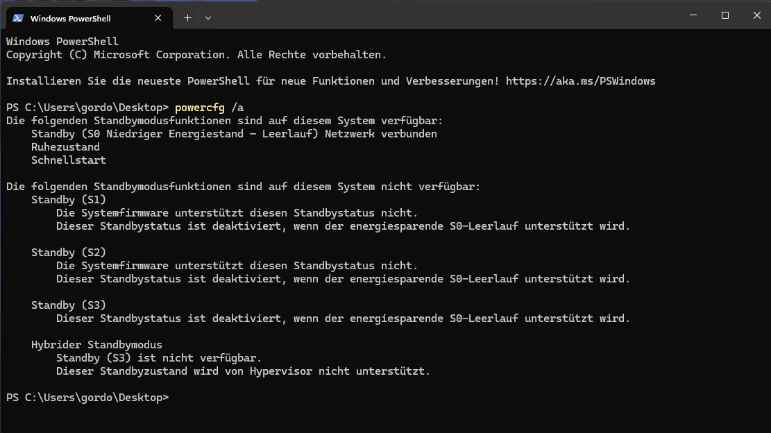 "Jetzt den Rechner neu starten und dann kann man wieder über powercfg -a in PowerShell prüfen, ob S3 nun wieder aktiviert ist."