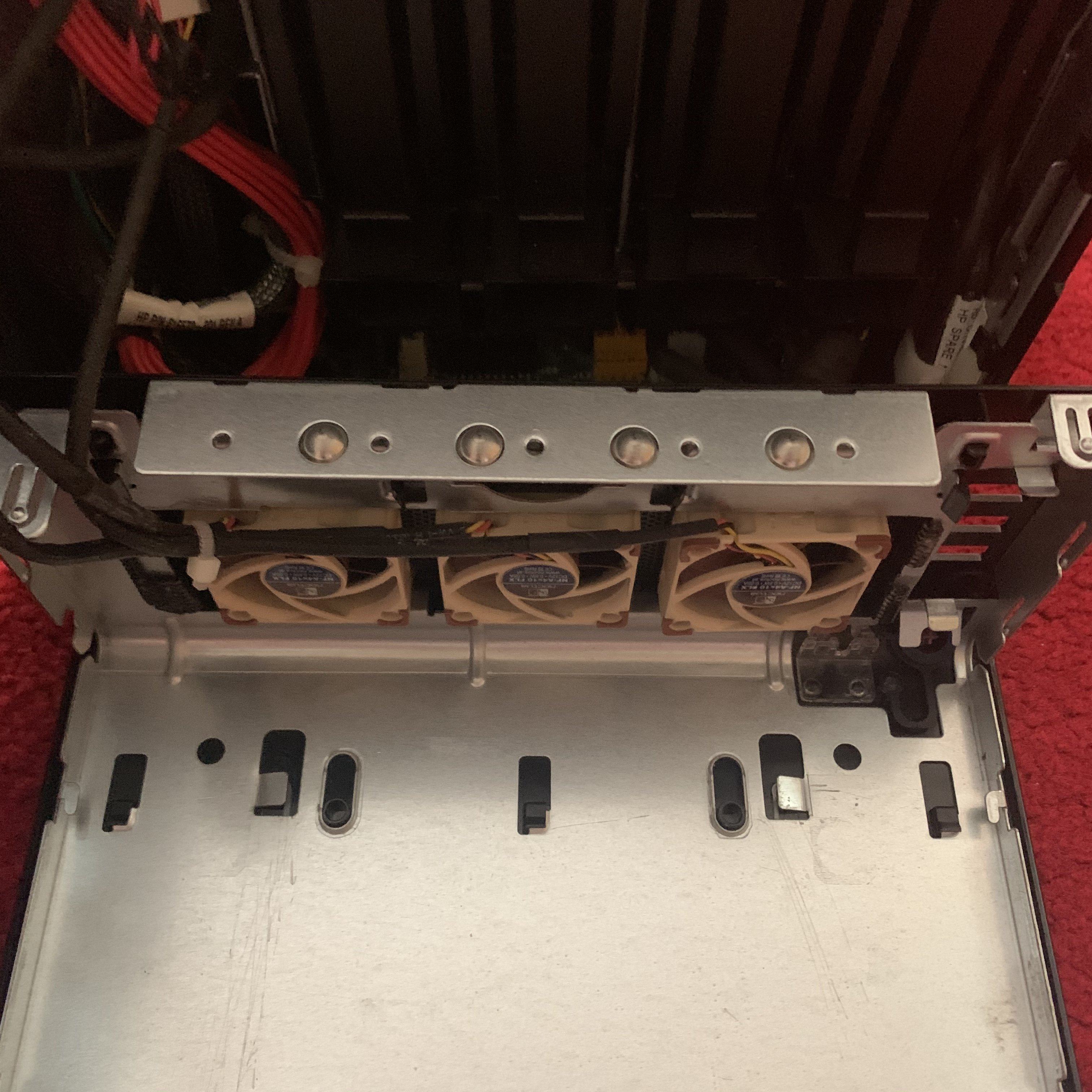 Hab für die Konfiguration aber auch den Serverlüfter hinten gewechselt, den Netzteillüfter gegen einen besseren, der Raid-Controller hat einen kleinen Noctua Lüfter auf den Kühler bekommen und die Laufwerksblende habe ich gegen eine "gelöcherte" getauscht und da auch noch drei kleine 10x40 Noctua Lüfter eingebaut.