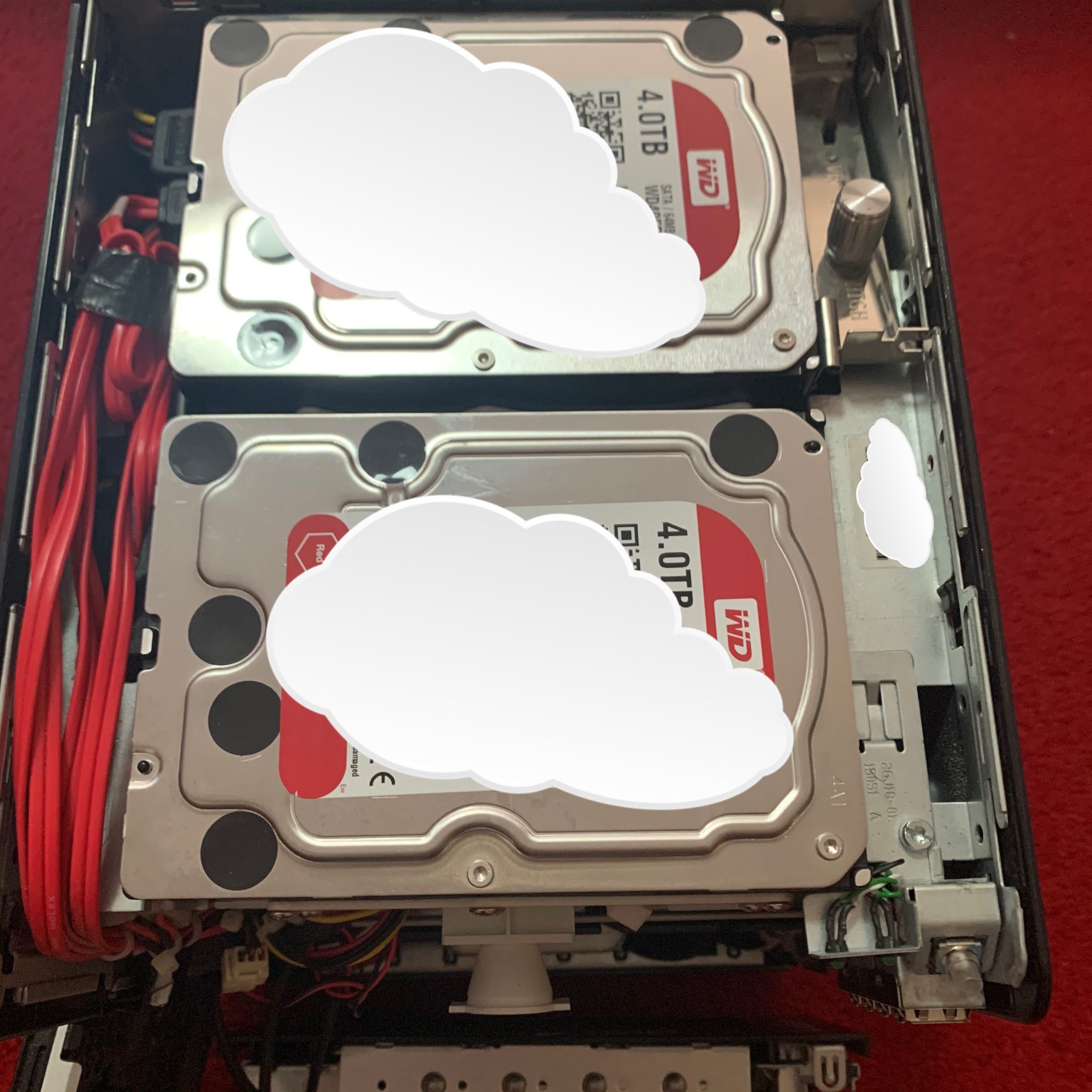 Verbaut sind die Festplatten (wenn man von vorne auf den Server schaut) von links nach rechts: SSD, 3TB, 3TB, 3TB