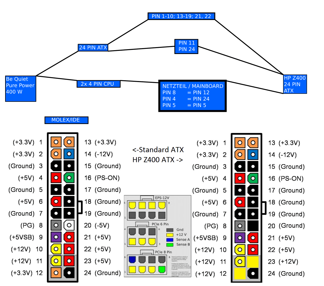 Nun wollte ich es gegen ein BeQuiet Pure Power 10 tauschen. Im Internet habe ich ein paar Beitrage gefunden, wie es möglich ist in ein anderes Netzteil zu nutzen. (Making an adaptor for a non standard ATX pinout HP Z400 - Badcaps Forums).