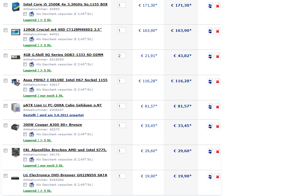 Ich dachte an einem i5 2400S der mit dem Synthe Kozunti passiv gekühlt wird, dazu das ASRock H67M-ITX (hat das schon WLan?), 8 GB Ram, ein BR-LW und eine 120GB SSD von Intel im 2,5" Format.