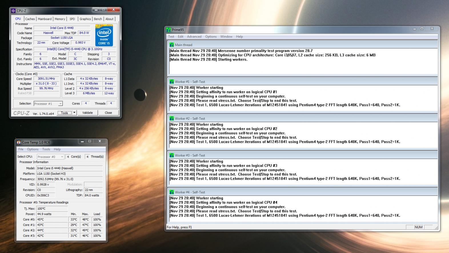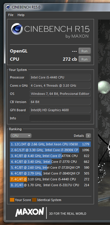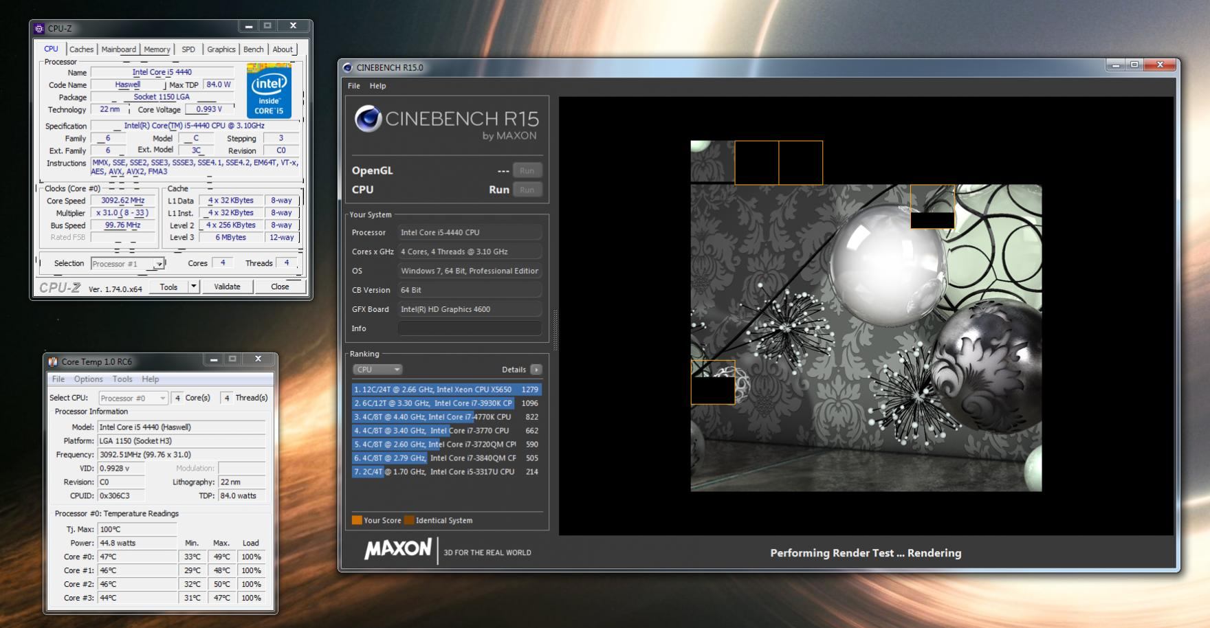 Ich habe ein Problem mit meiner CPU, und zwar habe ich miserable Performance, deswegen habe ich gerade eben mal Cinebench gestartet und habe feststellen müssen, dass ich maximal einen Score von 250 punkten bekomme. Das ist ungewöhnlich da im Internet gepostete Cinebench Scores mit dieser CPU circa bei 480 ausfallen. Ich habe mit CoreTemp fest gestellt, dass ich unter Volllast maximal 44Watt verbrauche, die Temperaturen gehen auch nich wirklich hoch (habe eine Artic Cooling Freezer 7). Ich wollte mal fragen ob mir vllt irgendjemand helfen kann oder mir sagen kann woran das liegt. Screenshots sind unten.