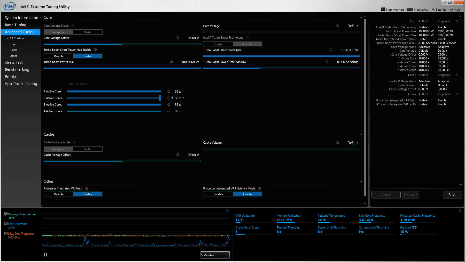 Also hab ich mir gedacht, dass ich das Intel Extreme Tuning Utility verwende. Hiermit konnte ich den Prozessor auf 3,8 Ghz "übertakten" wobei man da kaum von wirklichem OC reden kann. Es ist nicht so, dass die CPU bei mehr überhitzt o.Ä. ich kann den Regler einfach nicht höher schalten. (Siehe Bilder)