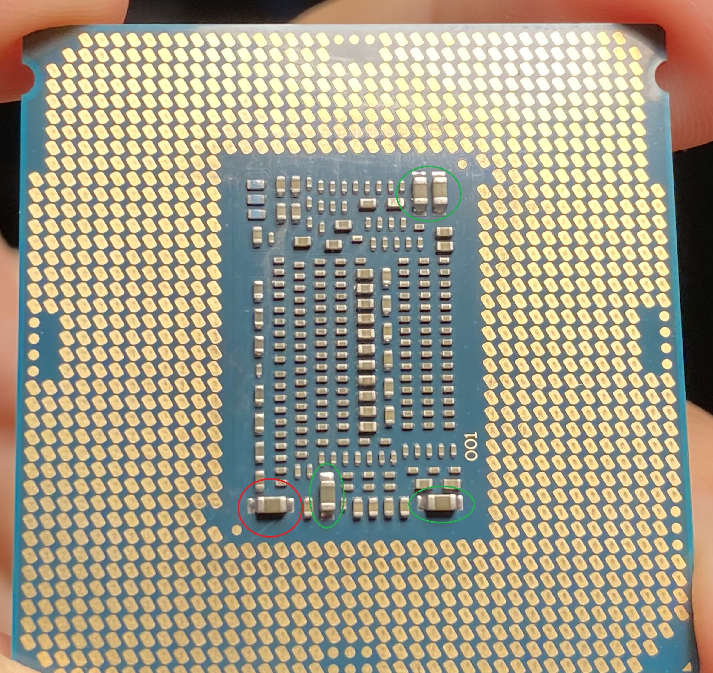 Die CPU hat keine physischen Schäden. Ist geköpft gewesen, aber wie gesagt absolut keine Schäden zu sehen. Ich habe dann mal spaßeshalber auf der Rückseite geschaut und die Bauteile durchgemessen.