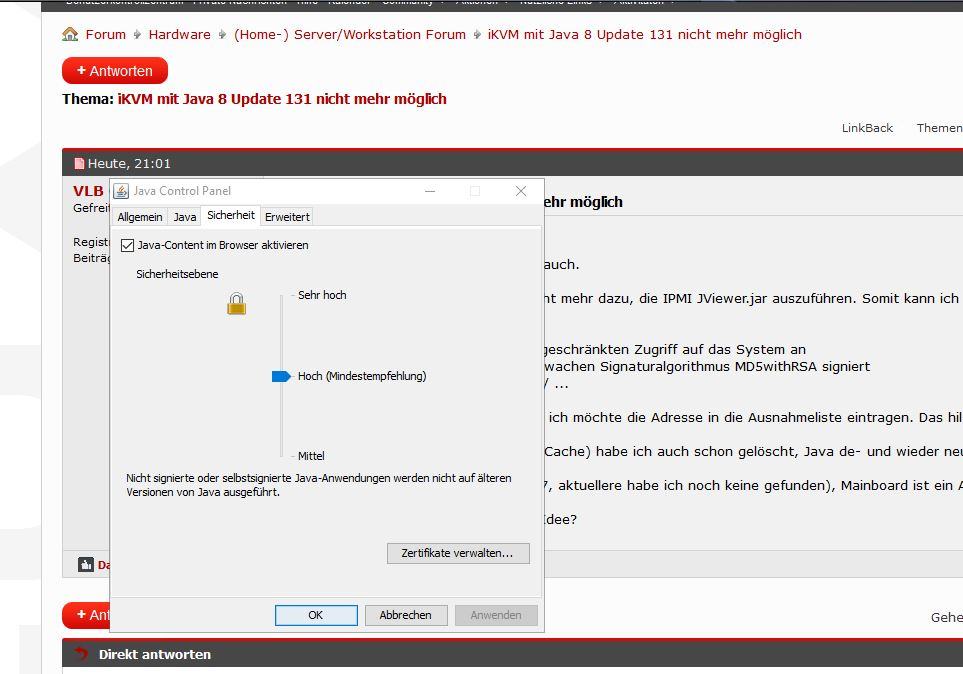 Ich bekomme das Java 8 Update 131 nicht mehr dazu, die IPMI JViewer.jar auszuführen. Somit kann ich den Rechner nicht mehr remote warten.