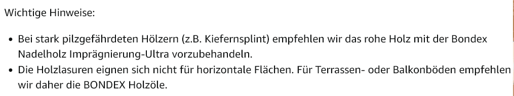 tja, stand da auf der Bondex Lasur leider nicht expliziet drauf. Der von Bondex meinte nur ich soll erstmal gar nichts machen. Wenn ich jetzt nochmals drüber streiche kann es noch schlimmer werden. Da ich nur dünn gestrichen haben meint er es kann durchaus sein das es nach ein paar Monaten rausgeht und dann im nächsten Jahr nur mit Öl streichen.Steht häufig auch auf der Dose selbst. Von der Bondex-Website: