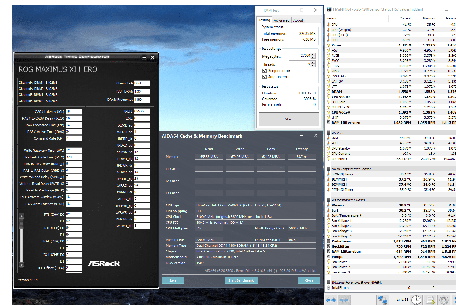 Die Spannungen sind, naja, wie sie sind. Um die schwächelnde Latenz aufzufangen (Windows-Autostart ist im Screenshot leer, sonst 40 ns glatt), prügle ich den tapferen 8600K auf 51/50, prime-stabil. Das wird in Volt bezahlt: Während karhu läuft, steht VCore auf 1,376 V, SA und IO mussten ebenfalls 2 Klicks rauf.