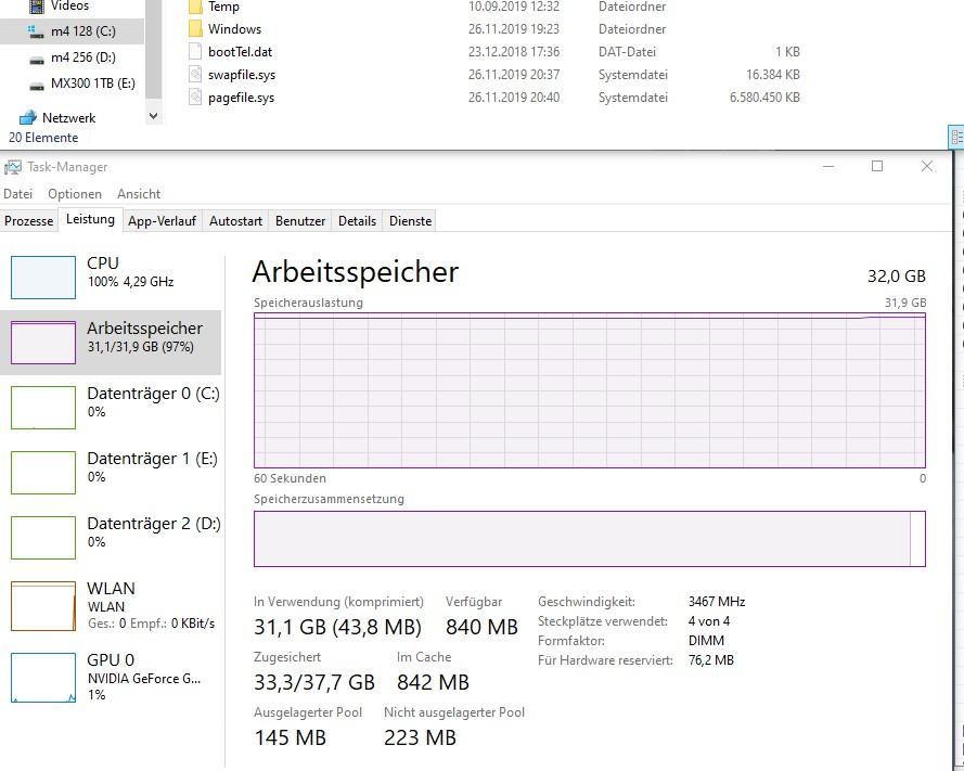 ich glaub, dass bei der hohen Rambelegung massiv ausgelagert wird, muss das kurz überprüfen wieviel GB da ausgelagert werden.
