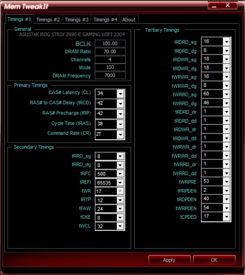Im UEFI hat Asus die volle Bezeichnung, im Tool dann abgekürzt. Du müsstest es wohl so einstellen, wenn du die Werte wie Benjamin1990 einstellen möchtest (und ich korrekt übertragen habe). Alles weitere kann @ AUTO bleiben, da für DualRank-Konfigurationen oder (performanceseitig) irrelevant.