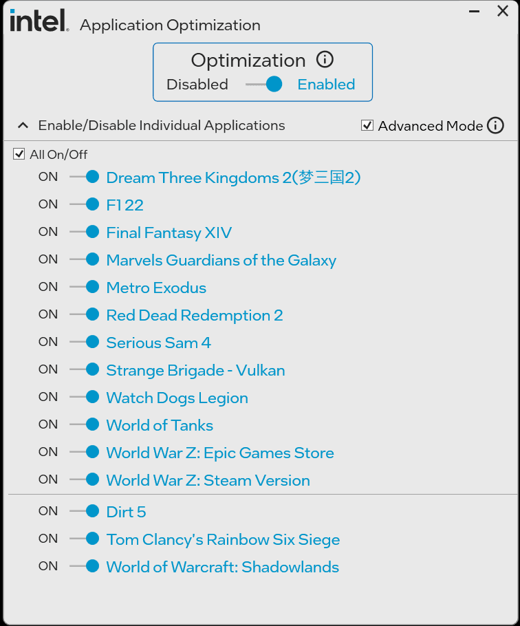 Intel® Application Optimization ermittelt und leitet Anwendungsressourcen in Echtzeit. Diese Richtlinie optimiert die Thread-Planung zusammen mit dem Anwendungs-Threading für ausgewählte Softwaretitel und kann die Leistung für unterstützte Anwendungen verbessern.