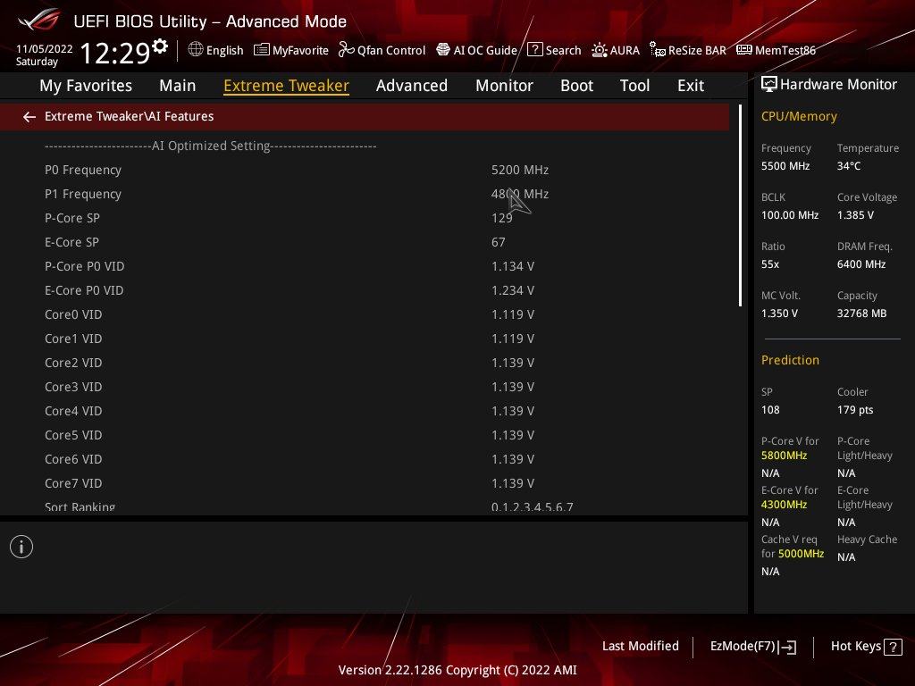 Moinsen, habe das Hero nun im Case, läuft soweit alles out of the box, XMP 1 eben geladen scheint zu funzen, mit den 6400 "standard" der Team RAMS. Ich lese ja ab und an bei overcklock net von problemen beim Z790 Asus wenn XMP geladen wird - das waren aber imho speeds von 7200 + bei denen drüben. Also ich lasse vorerst das Auslieferungsbios (401) . Nun Butter bei die Fische, ich kenne mich im Asus Bios null aus, was muss ich tuen um die prediction von den P bzw E-cores auszulesen...... Danke
