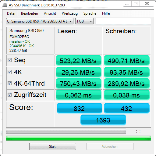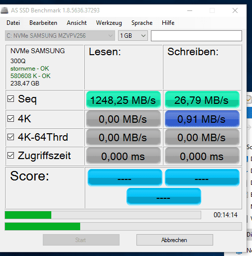 Bisher habe ich keine Einstellungen im Bios oder sonstwo gemacht. Lasse mal ein paar Benchmarks laufen. Hier die Standard-SSD: