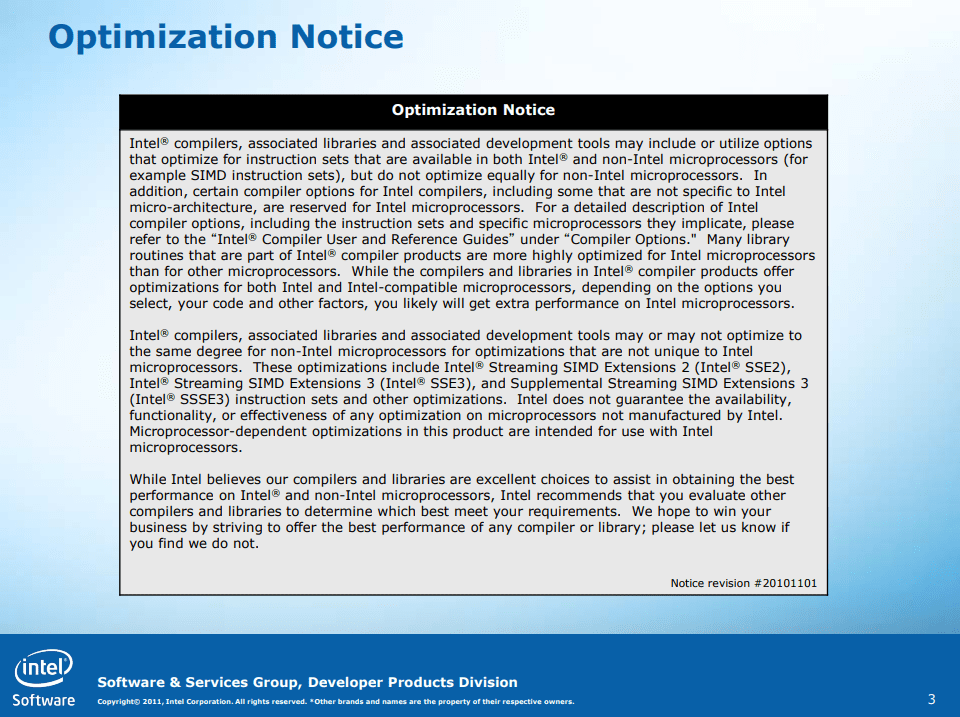 Natürlich wird sich Intel auf den Standpunkt "unsere Compiler, unsere MKL, unsere Entscheidung" zurückziehen.