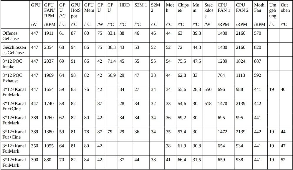 Die ersten beiden Messungen wurden ohne deshroud Mode durchgeführt. Ohne diesem Mode würden ein paar zusätzliche Lüfter im Gehäuse nicht schaden, da alle Lüfter zu weit entfernt von den Gehäuseaußenkanten liegen. Insgesamt sieht es aber so auch schon nicht schlecht aus.