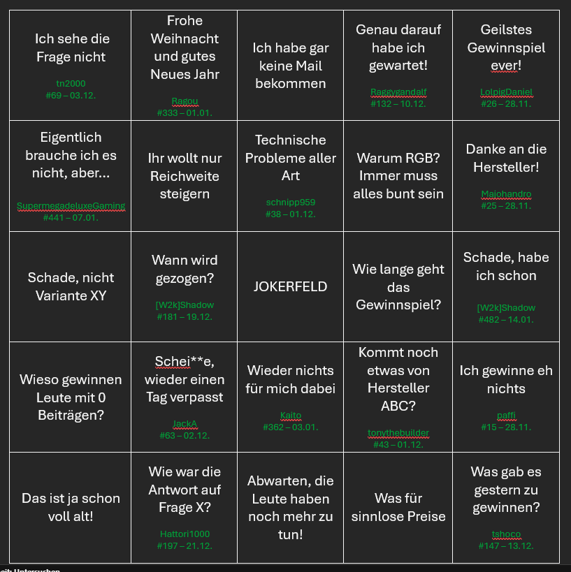 geil, ich bin dabei !!!!Mein Bingo hat @[W2k]Shadow am 14.01. gewonnen (letzte Spalte, mittleres Feld).