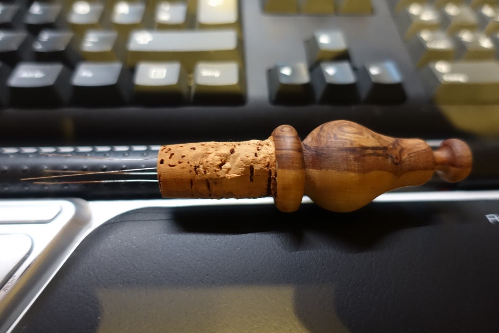 Mein selbstgebasteltes WDT besteht aus einem Flaschenverschluss von Etsy (aus Olivenholz – weil ich auch alle Griffe und Deckel an der ECM und der Mühle auf Olive umgerüstet habe) und superdünnen lange Nadeln, mit denen man anscheinend normalerweise die Düsen von 3D-Druckern reinigt. Die wurden damals im kaffee-netz dafür empfohlen und das funktioniert auch super. Das hat nun gute 3 Jahre treue Dienste geleistet, aber nun darf mal was Neues her.