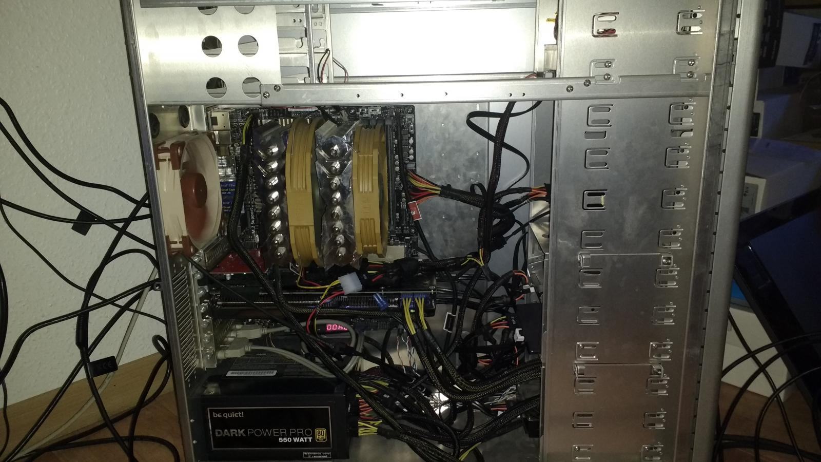 Das Gehäuse ist ein Lian Li PC-A77, die Gehäuse Lüfter sind alle durch Noctuas ersetzt worden. So siehts jetzt aus, noch mit ner 980Ti und sehr unaufgeräumt: