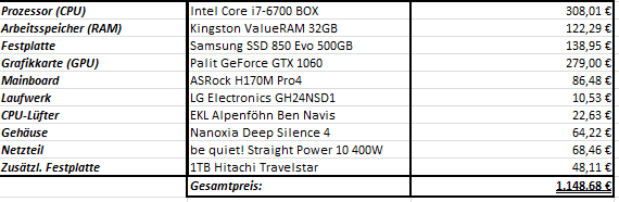 - als prozessor würde ich eher den etwas schnelleren i7 6700k oder einen kaum langsameren aber deutlich günstigeren xeon 1231v3 nehmen. in jeden fall solltest du den prozessor aber nicht als "tray", sondern als "boxed" kaufen.